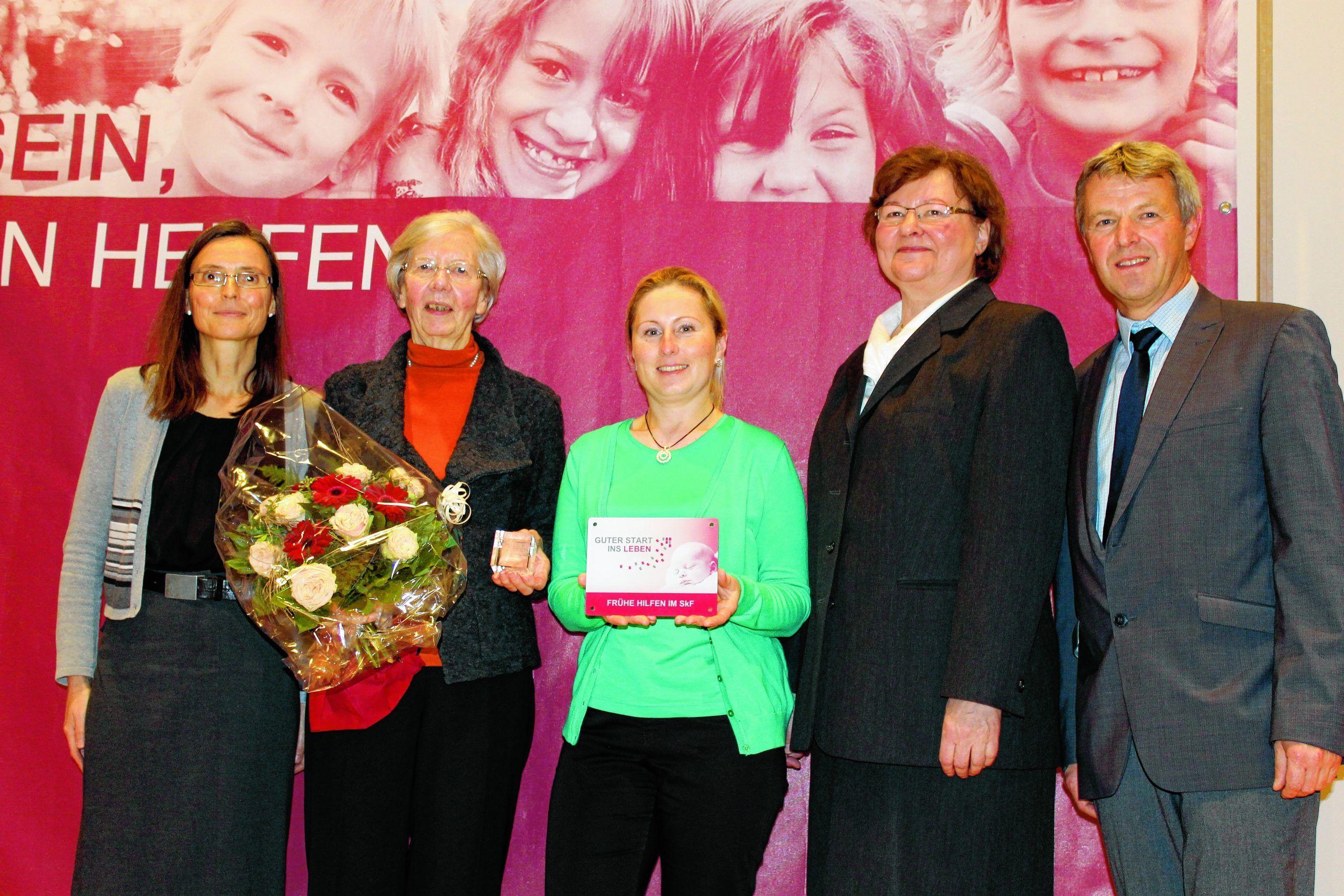 Freuen sich über die Ehrung (v. l.): Marietta Wagner, SkF-Gesamtverein, Roswitha Bauer-Mehls (SkF-Kristall), Yvonne Knura (Frühe Hilfen), Dr. Ulrike Wiards (Vorsitzende) und Michael Gebauer (SkF-Geschäftsführer).