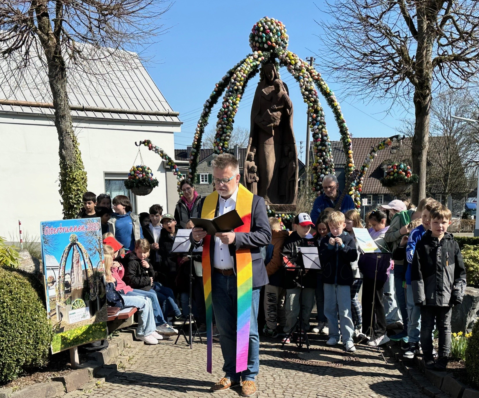 Mehr als 150 Bürger und Bürgerinnen, Kinder aus Grundschule und Kindergärten, so wie geladene Gäste erfreuten sich an den rund 3.000 bunt bemalten Ostereiern, die mit viel Mühe und Aufwand über der Marienstatue kunstvoll zusammengefügt waren. Die Gäste der Welschen Ennester Caritas-Tagespflege hatten in diesem Jahr mit einer großen Anzahl bemalter Eier zu diesem beeindruckenden Gesamtbild beigetragen.