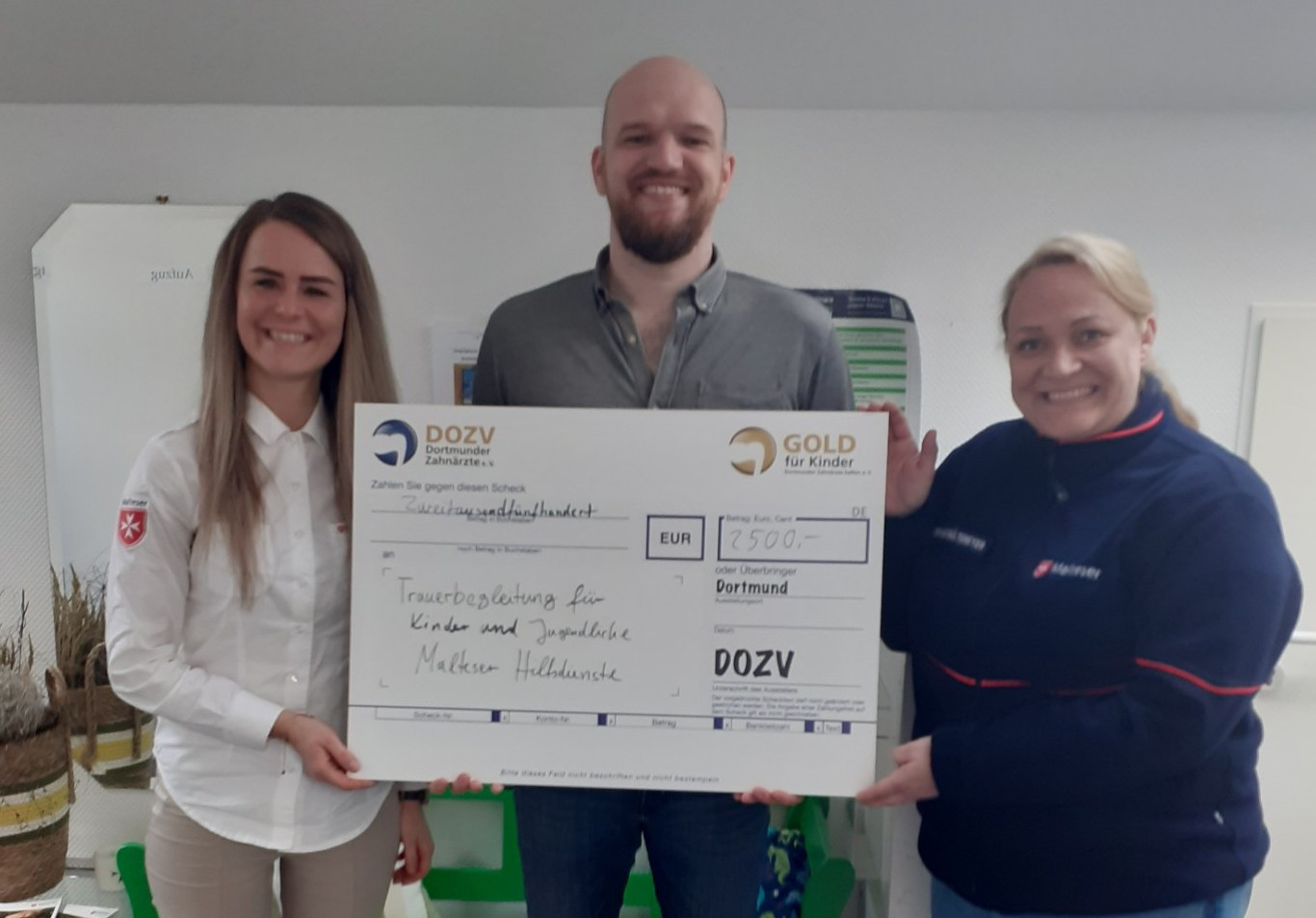 2.500 Euro – so lautete die Summe auf dem symbolischen Scheck, den Lukas Lehrich, Vorsitzender des Dortmunder Zahnärzte helfen e. V., den Malteser Kinder- und Jugendhospizdiensten überreichte.
