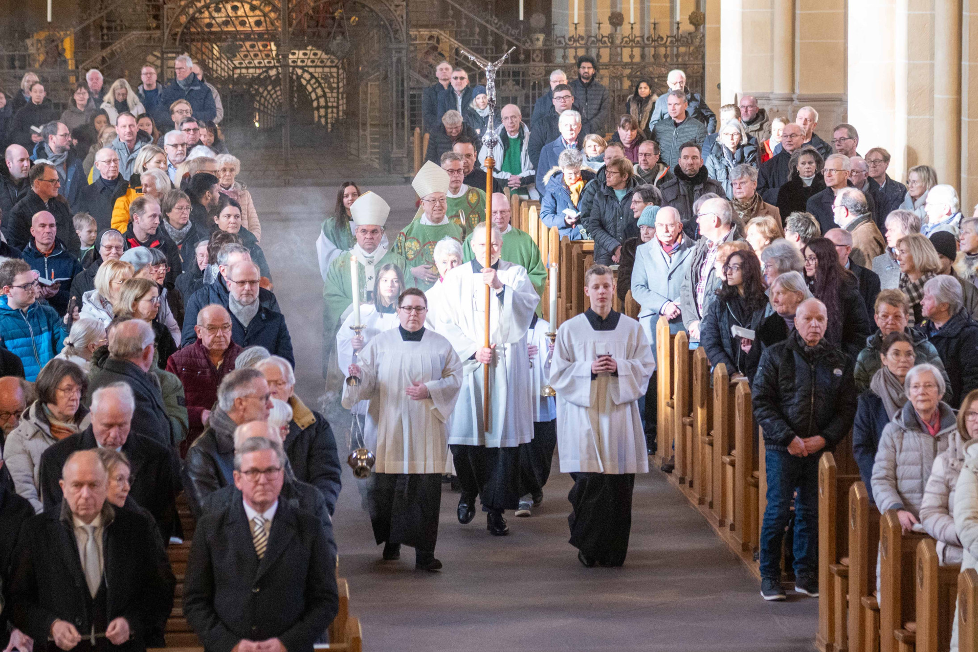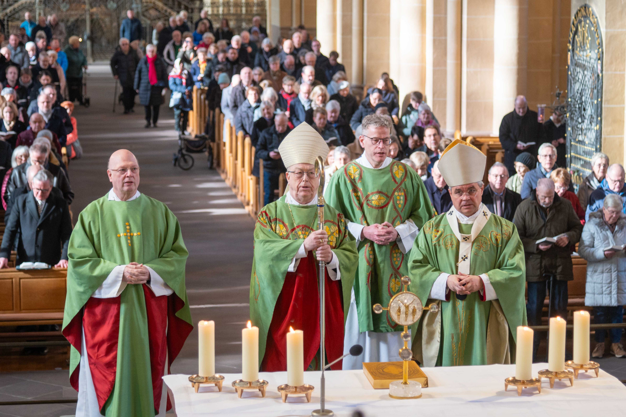 Der Paderborner Erzbischof em. Hans-Josef Becker feierte mit zahlreichen Gläubigen im Hohen Dom zu Paderborn zu seinem 25-jährigen Bischofsjubiläum einen Dankgottesdienst: Am 23. Januar 2000 hatte der aus Warstein-Belecke stammende Geistliche im Paderborner Dom die Bischofsweihe empfangen, um zunächst von 2000 bis 2003 als Weihbischof und dann bis 2022 als Erzbischof des Erzbistums Paderborn zu wirken. Sein Nachfolger Erzbischof Dr. Udo Markus Bentz sowie der langjährige Generalvikar von Erzbischof em. Becker, Domdechant Apostolischer Protonotar Alfons Hardt, konzelebrierten im Dankgottesdienst.