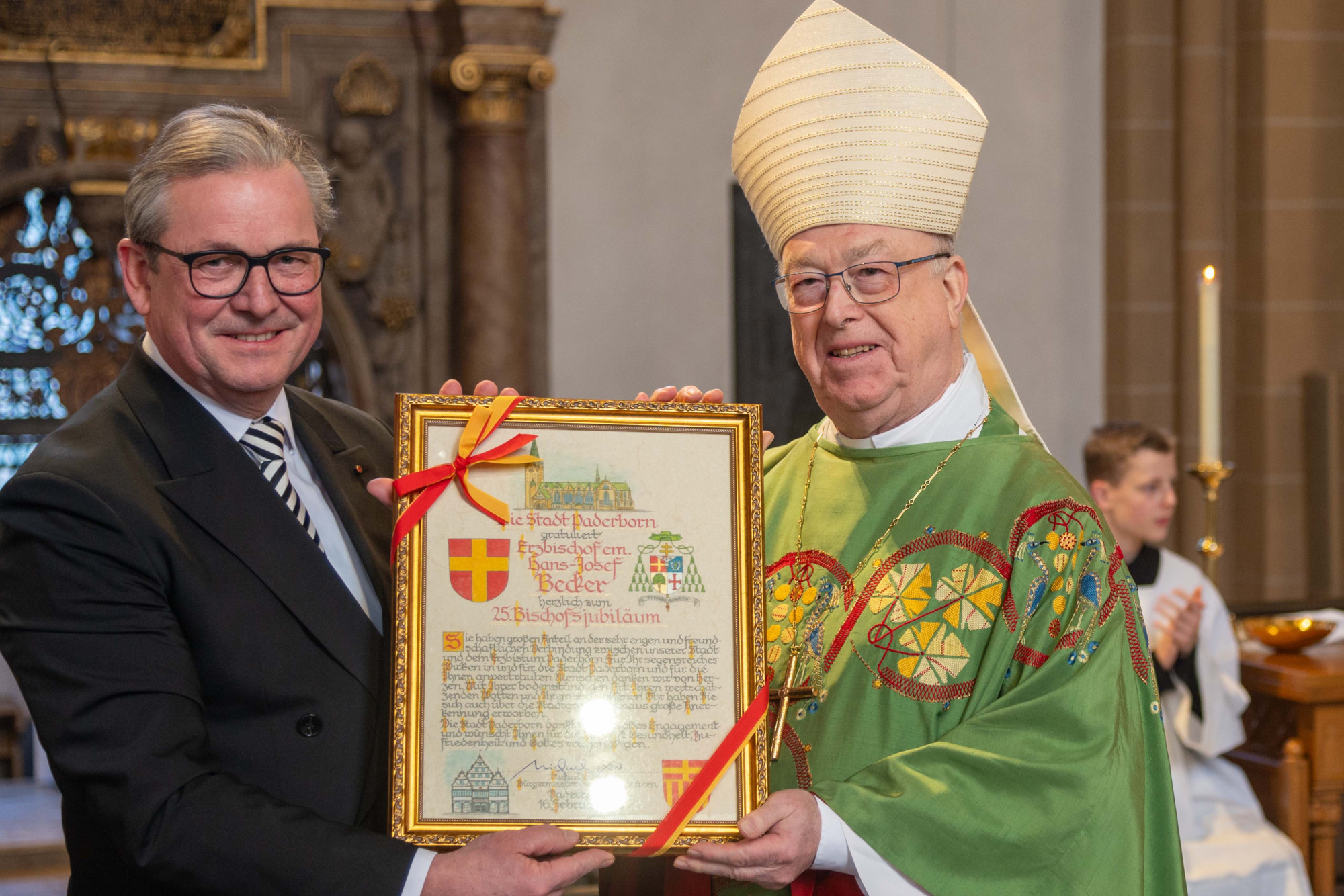 Paderborns Bürgermeister Michael Dreier gratulierte persönlich sowie im Namen der Stadt Paderborn. Er würdigte in seinem Grußwort die fachliche Kompetenz und das menschliche Einfühlungsvermögen von Erzbischof em. Hans-Josef Becker. Er dankte dem Bischofsweihejubilar für dessen „enge Beziehung zu den Bürgerinnen und Bürgern“, er sei ein „Erzbischof zum Anfassen“, dem das Schützenwesen am Herzen liege. „Ich danke Ihnen für Ihr Wirken im Erzbistum und in der Stadt Paderborn, für Ihre enge und freundschaftliche Verbundenheit“, unterstrich Bürgermeister Dreier und überreichte dem Emeritus eine von Egon Hüls gestaltete Urkunde.