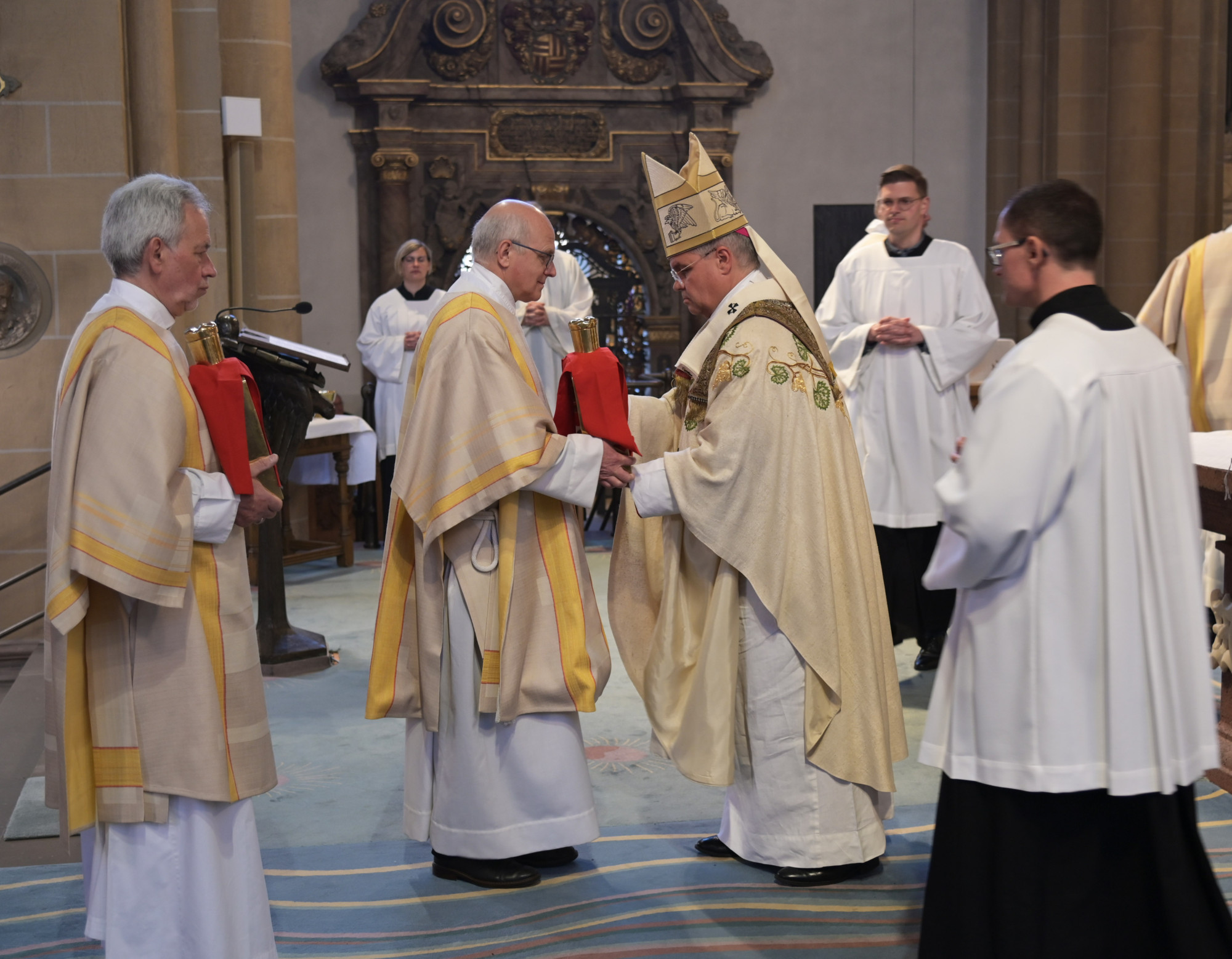 Nach der Erneuerung des Weiheversprechens begann der Teil der Chrisammesse, dem sie ihren Namen verdankt: 16 Ständige Diakone überreichten Erzbischof Dr. Udo Markus Bentz vor dem Altar feierlich die heiligen Öle, mit denen im Erzbistum die Sakramente gespendet werden – der Paderborner Erzbischof hatte die Ständigen Diakone erstmals zum Priestertag eingeladen als Zeichen der Wertschätzung ihres Dienstes.