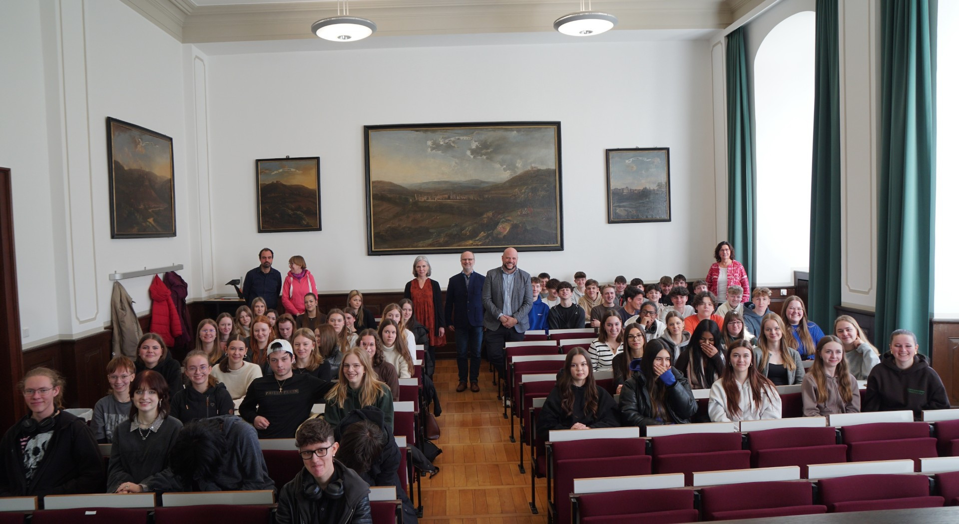 Die Schülerinnen und Schüler der Jahrgangsstufe EF des Mariengymnasiums Arnsberg besuchten zusammen mit ihren Lehrerinnen Elke Mueer und Ingrid Springer, sowie ihrem Lehrer Benjamin Ante die SchulUni.Theologie der ThF. Professor Dr. Dr. Andreas Koritensky, Lehrstuhlinhaber für Systematische Philosophie, und Dipl.-Theol. Jessica Bohn, Referentin am Rektorat, begrüßten die Schülerinnen und Schüler im Hörsaal der Fakultät.