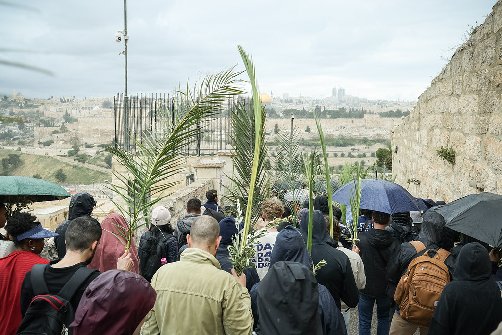 Pünktlich zu Beginn der traditionellen Palmprozession über den Ölberg öffnete sich der Himmel zum Wolkenbruch. Die Gläubigen nahmen es gelassen. „Endlich mal Palmsonntag ohne Sonnenbrand“, scherzte ein deutscher Ordensmann. „Der Regen ist ein Segen“, erwiderte eine ägyptische Ordensfrau, die dem Niederschlag in nahöstlicher Manier nur Gutes abgewinnen konnte. Zwischen die oft kunstvoll geflochtenen Palmwedel mischten sich also zahlreiche Regenschirme.