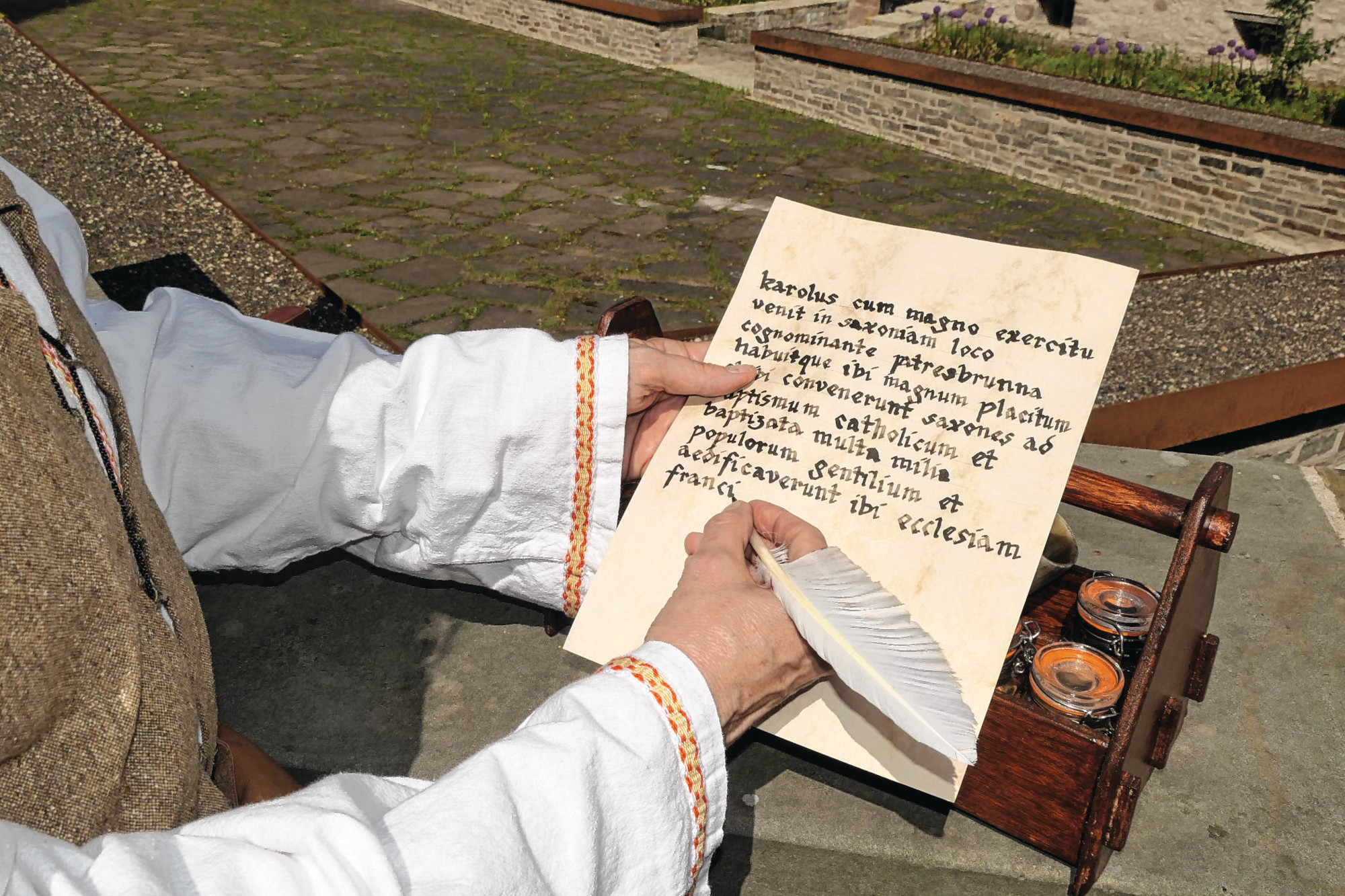 Von 18 bis 22 Uhr finden Mitmach-Aktionen für Erwachsene und Kinder zum Bauen und Schreiben im Mittelalter statt. In einem kleinen „Skriptorium“, der Schreibstube in Klöstern, entdecken Besuchende Anschauungsmaterial zur Buchmalerei und die wichtigsten Zutaten, um selbst Tinte und Farben herzustellen. Sie können dann ausprobieren, mit Gänsefeder und Tinte zu schreiben sowie Initialen mit frisch angerührten Farben zu malen – wie im Mittelalter.