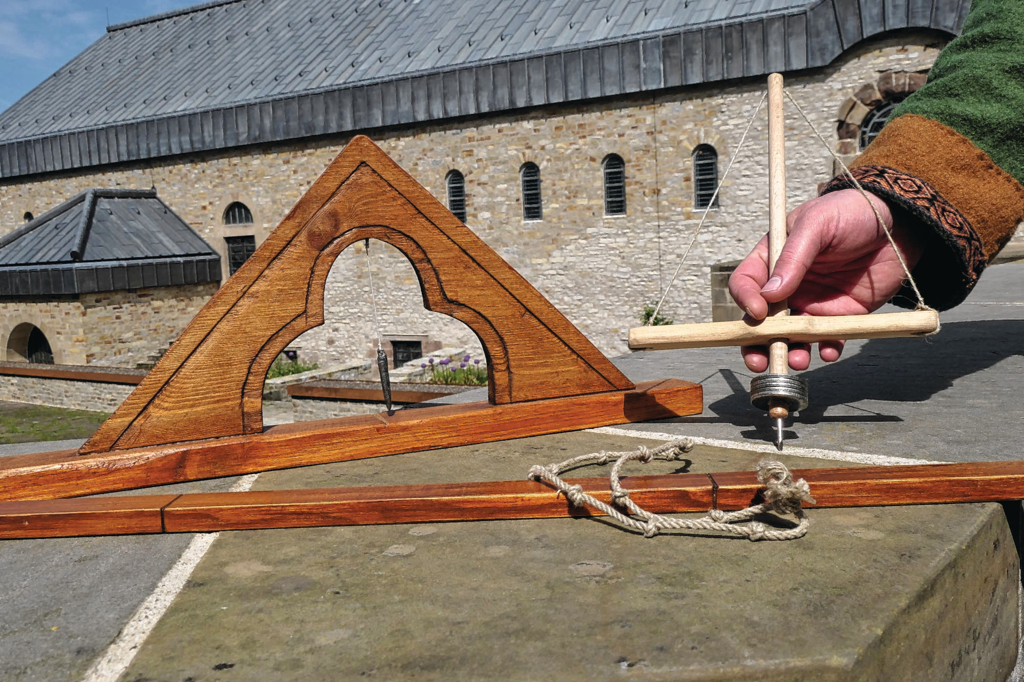 Auch das mittelalterliches Bauen entdecken Besuchende während der langen Museumsnacht: Von 18 bis 22 Uhr erleben sie an verschiedenen Stationen, wie Baumeister vor 1.000 Jahren ohne Montagekleber einen Dachstuhl bauten und ohne Geodreieck einen rechten Winkel hinbekamen. Besuchende drehen an einer Mini-Reeperbahn Kordeln oder probieren den Drillbohrer aus, die sogenannte Dreule, ein Gerät zum manuellen Antrieb eines Bohrers.