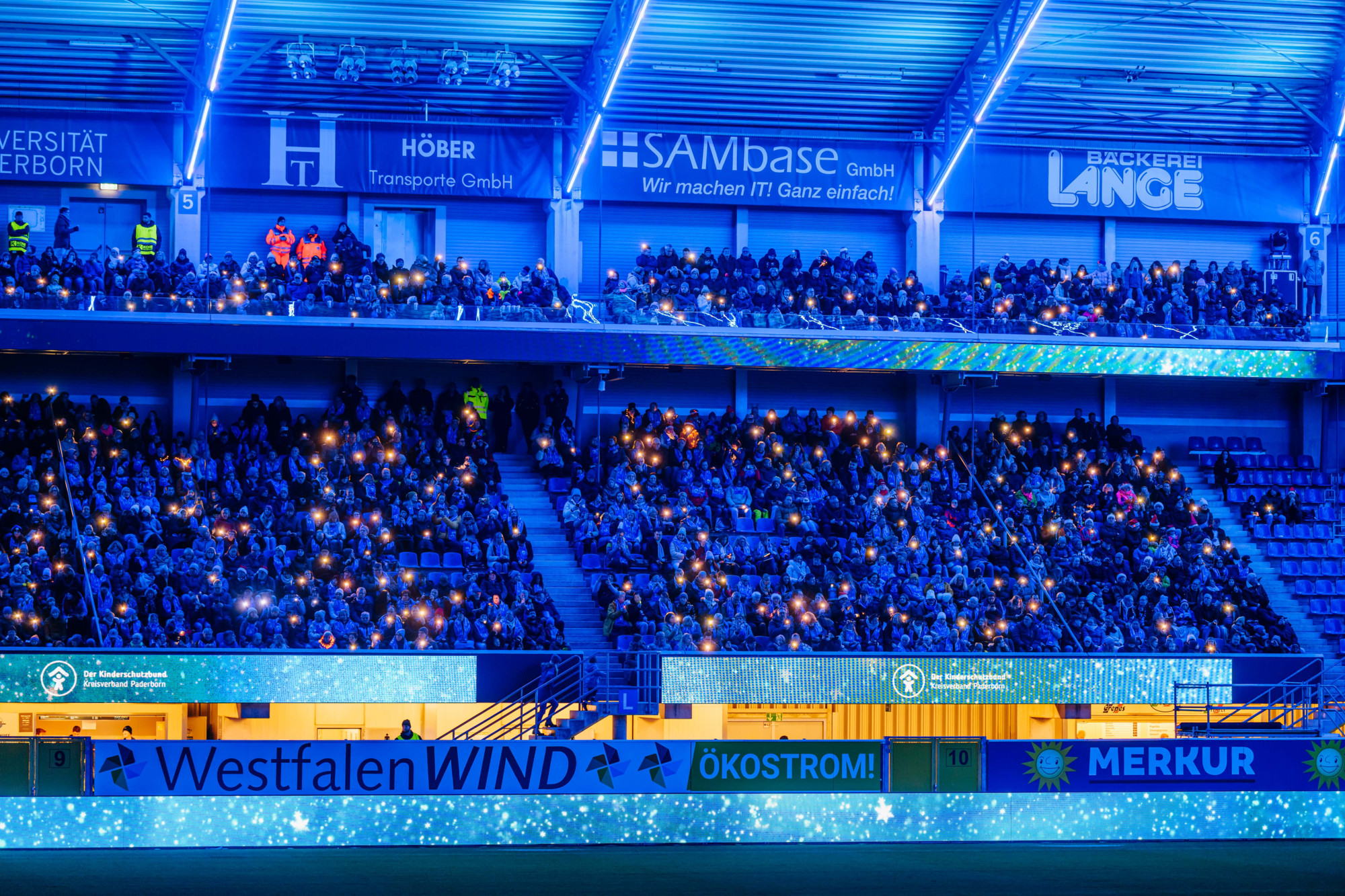 Die Tickets für das erste Weihnachtssingen in der Home-Deluxe-Arena waren binnen kurzer Zeit ausverkauft. Das Kontingent – zunächst auf 7000 Tickets beschränkt, wurde schnell aufgestockt. Am dritten Advent war es schließlich so weit: 9000 Stimmen versammelten auf den Rängen der Arena. Weitere 400 Chorsängerinnen und -sänger, angeleitet von Domkantor Patrick Cellnik, füllten die Südtribüne. Insgesamt zählte die Arena des Paderborner Zweitligisten an diesem Sonntag rund 10.000 Gäste. 500 von ihnen waren bereits vor Beginn der 75-minütigen Weihnachtssingen-Premiere echte Glücklichter. Gemeinsam mit ihrem ganz persönlichen Glücklicht hatten sie am Gewinnspiel der Glücklicht-Aktion des Erzbistums teilgenommen und Tickets für das Weihnachtssingen gewonnen.