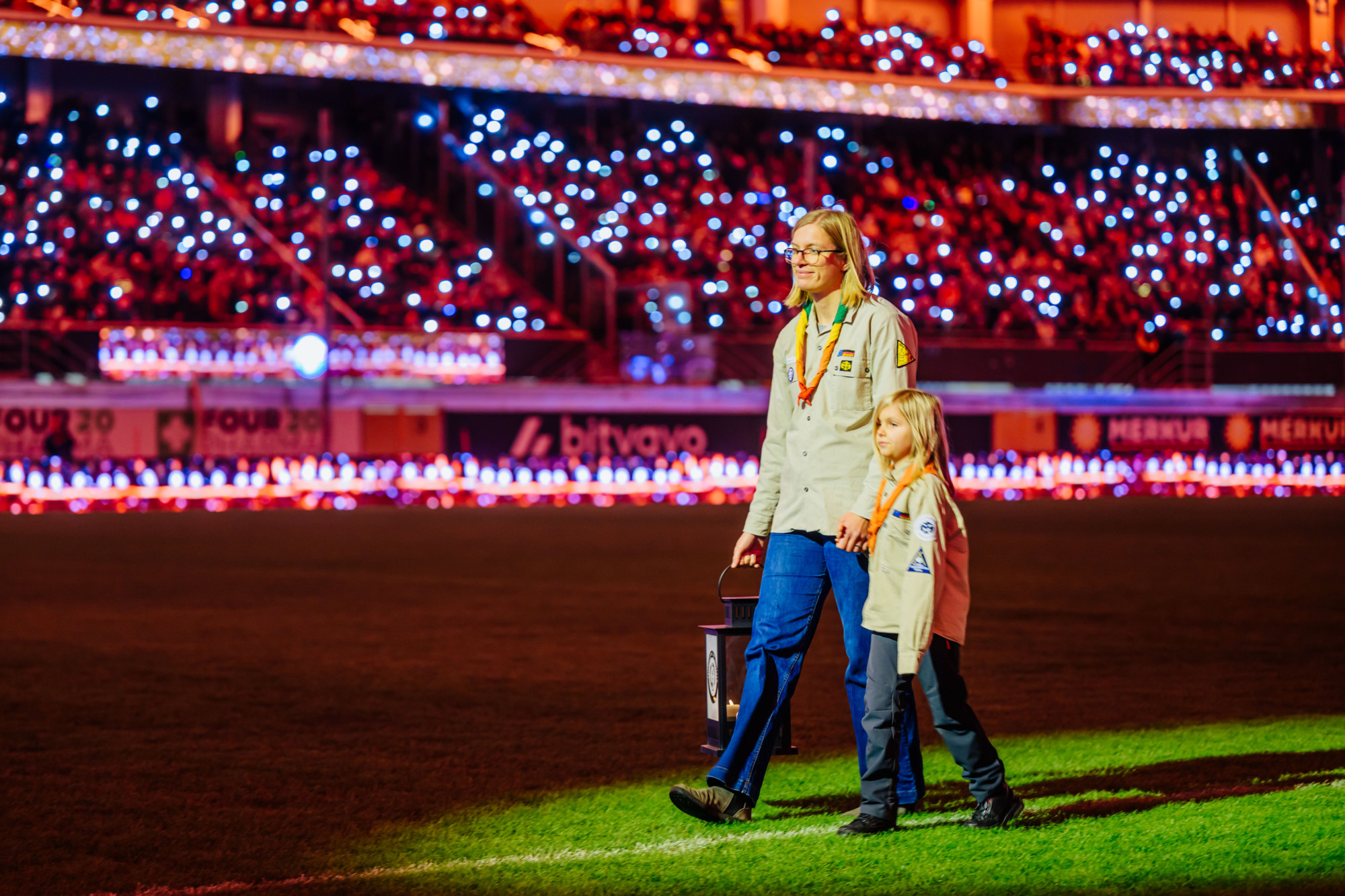 Die Botschaft von Weihnachten, dem Fest der Liebe, der Hoffnung und des Friedens, wurde nicht nur musikalisch überbracht: Gemeindereferentin Alexandra Boxberger nutzte die Zeit zwischen den Gesangseinlagen, um die Weihnachtsgeschichte in vier Teilen vorzutragen. Als unverkennbares Zeichen des Friedens fand das Friedenslicht von Bethlehem, getragen von zwei Pfadfinderinnen und begleitet von den Klängen von „das Friedenslicht soll leuchten“, schließlich seinen Weg ins Stadion – ein andächtiger Moment, um Inne zu halten.