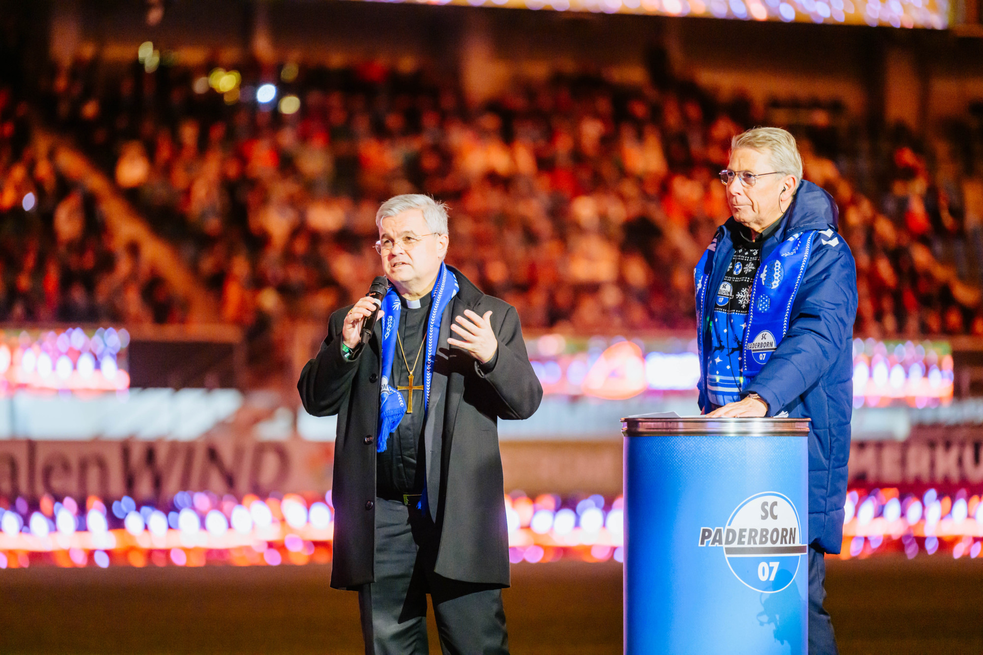 Dass die Stimmung nicht nur gut, sondern vor allem emotional werden würde, ließ Domkapitular Benedikt Fischer bereits in seiner Eröffnungsrede anklingen: „Wer singt, erinnert sich meist an Ereignisse und Zeiten von früher, was allein schon für eine großartige Stimmung sorgt. Heute, wenn wir mit Tausenden gemeinsam singen, wird eine unglaubliche Atmosphäre entstehen. Benedikt Fischer, der Leiter des Pastoralen Raums Paderborn ist und der das Weihnachtssingen gemeinsam mit Stadionsprecher Jürgen Lutter moderierte, sollte Recht behalten. Von Weihnachtsklassikern der Popmusik, über beliebte Kinderlieder, bis hin zu kirchlichen Weihnachtsliedern war für jeden und jede etwas dabei. So war der 10.000-Stimmen-starke Chor stets textsicher und lautstark zu vernehmen – egal, ob Weihnachtswünsche, formuliert durch „All I want for Christmas“, Eindrücke aus der „Weihnachtsbäckerei“ oder die frohe Botschaft der Hoffnung und des Friedens in „Kommet, ihr Hirten“ – nach rund 20 Gesangsstücken hatte sich die Atmosphäre in der Home-Deluxe-Arena spürbar verändert.