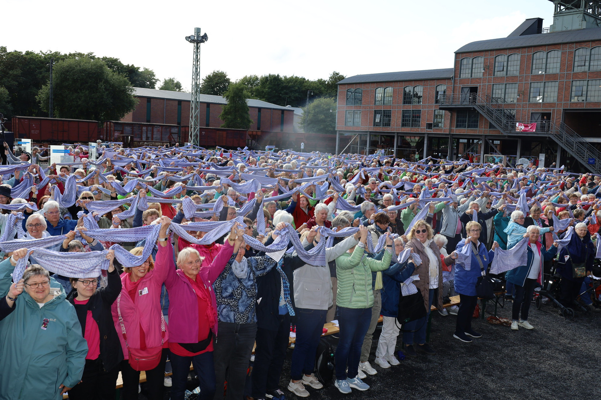 Dorothee Brünger und Verena Hahn, ehemaliges und neues Mitglied im Diözesanleitungsteam, stiegen hinauf auf den Förderturm, um aus 36 Metern Höhe die biblische Botschaft zu verkünden. Alle Frauen hatten zur Erinnerung ein „Grubentuch“ erhalten, das sie zum Friedensgruß dem Himmel entgegenstreckten. Der Bergmannsgruß „Glück auf“ galt auch für das Wetter. Für erste Gänsehautmomente sorgte ein Chor. Als Begrüßung stimmten die Diözesanvorsitzende Monika Bunsen und der Diözesanpräses Roland Schmitz die eigens getextete kfd-Wallfahrtshymne zur Melodie des Steigerlieds an.