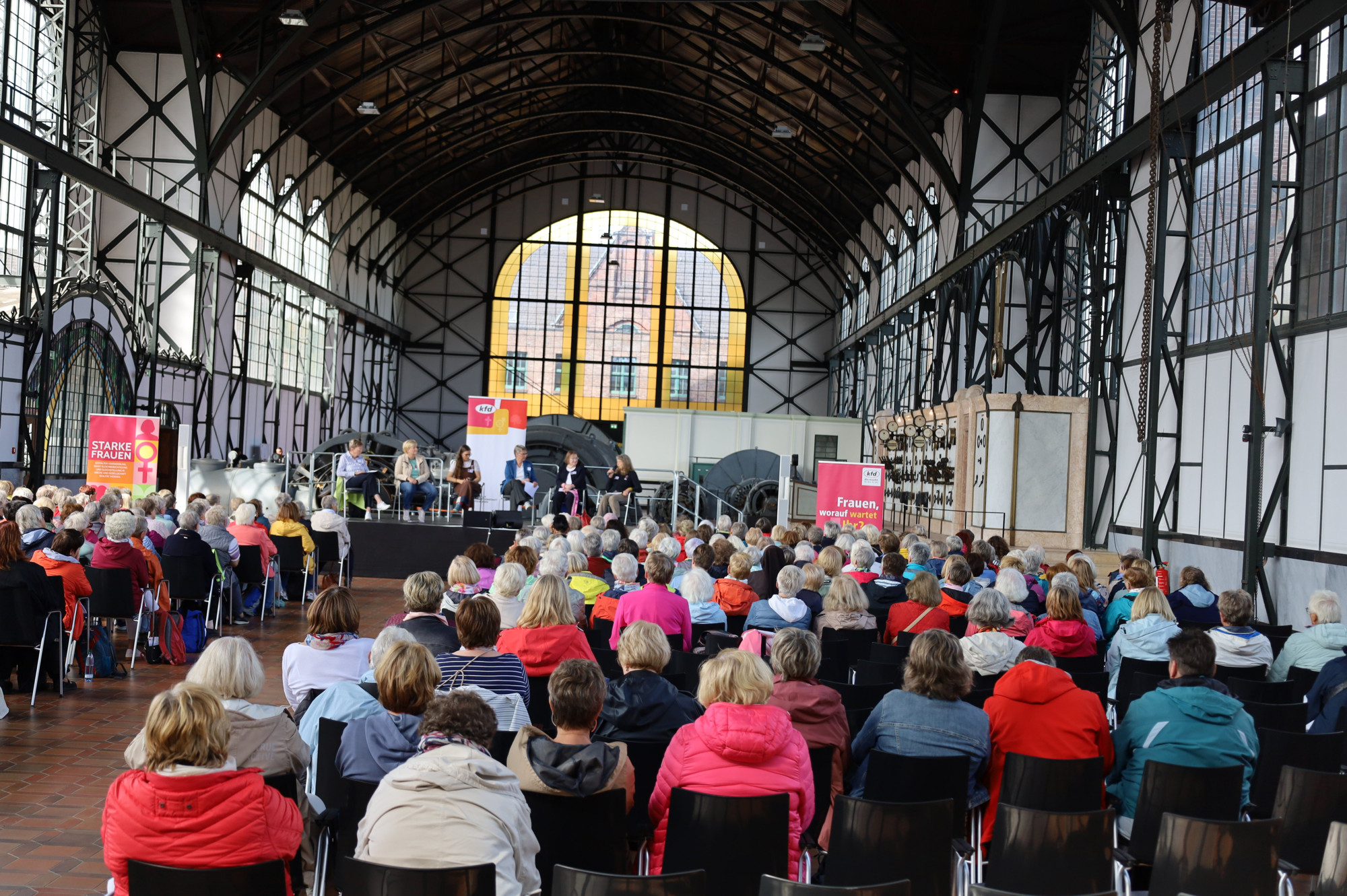 Hochkarätige Gäste begrüßte die Moderation Claudia Auffenberg bei den Podiumsdiskussionen in der Maschinenhalle. Ulrike Böhmer schlüpfte in ihre Rolle als Religionspädagogin. Die Landtagsabgeordnete Dagmar Hanses ist Sprecherin für Jugendpolitik. Die Theologin und Autorin Dr. Annette Jantzen betreibt den Block www.gotteswort-weiblich.de. Lucia Lagoda ist stellvertretende kfd-Bundesvorsitzende. Marie-Simone Scholz ist pastorale Mitarbeiterin für innovative Frauenpastoral im Erzbistum. Die Praxisberaterin Angelika Tuschhoff begleitet kfd-Ortsgruppen bei Veränderungsprozessen. Eva-Maria Pieper ist Geistliche Leiterin der kfd Dortmund. Während der Diskussion kamen sie auch mit den Zuhörerinnen ins Gespräch. Themen waren „Frauen gestalten Wandel“, „Patriarchal strukturierte Kirche“, „Begabungen und Kompetenzen“ sowie „Vielfalt leben in Respekt“.