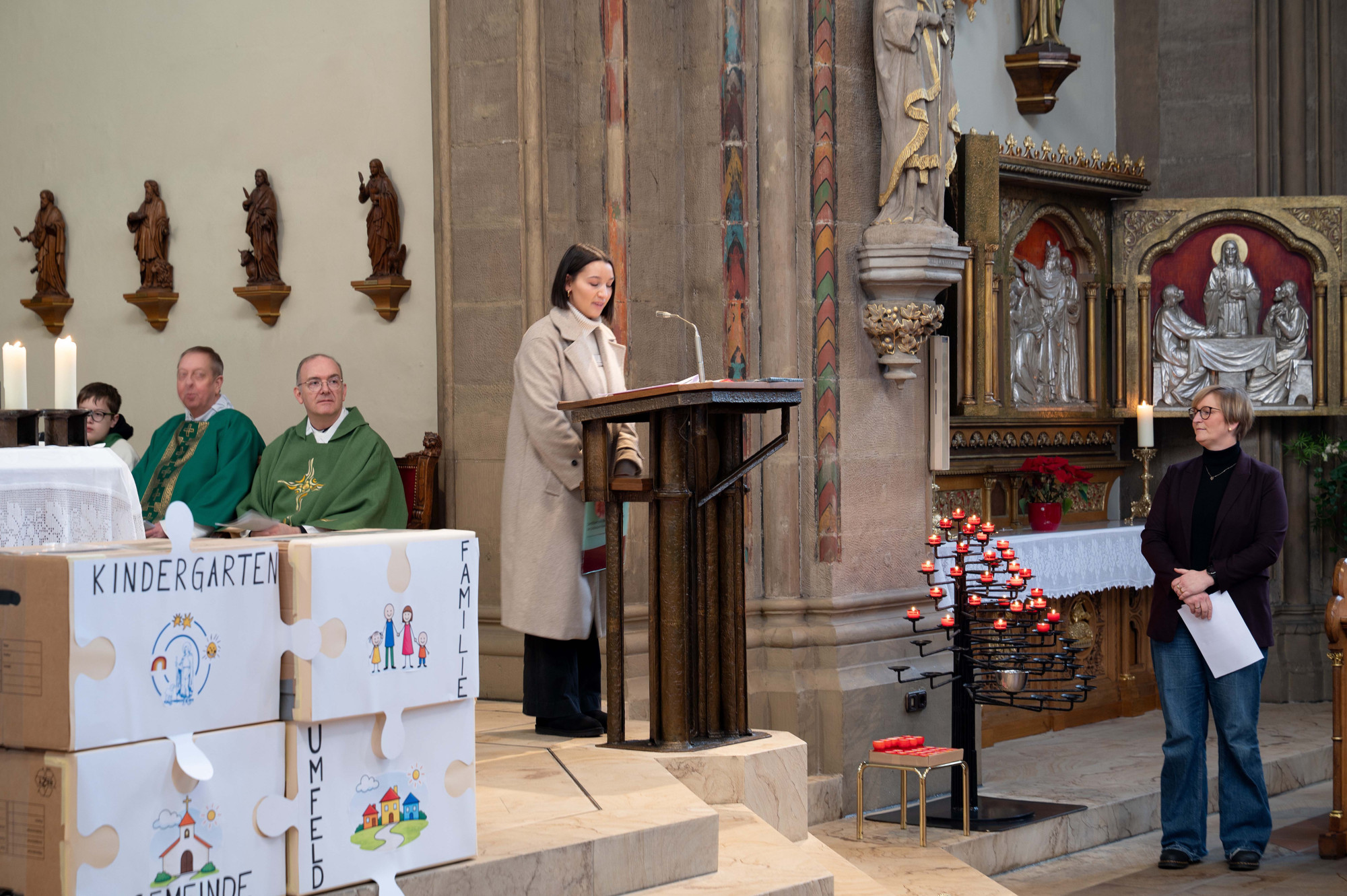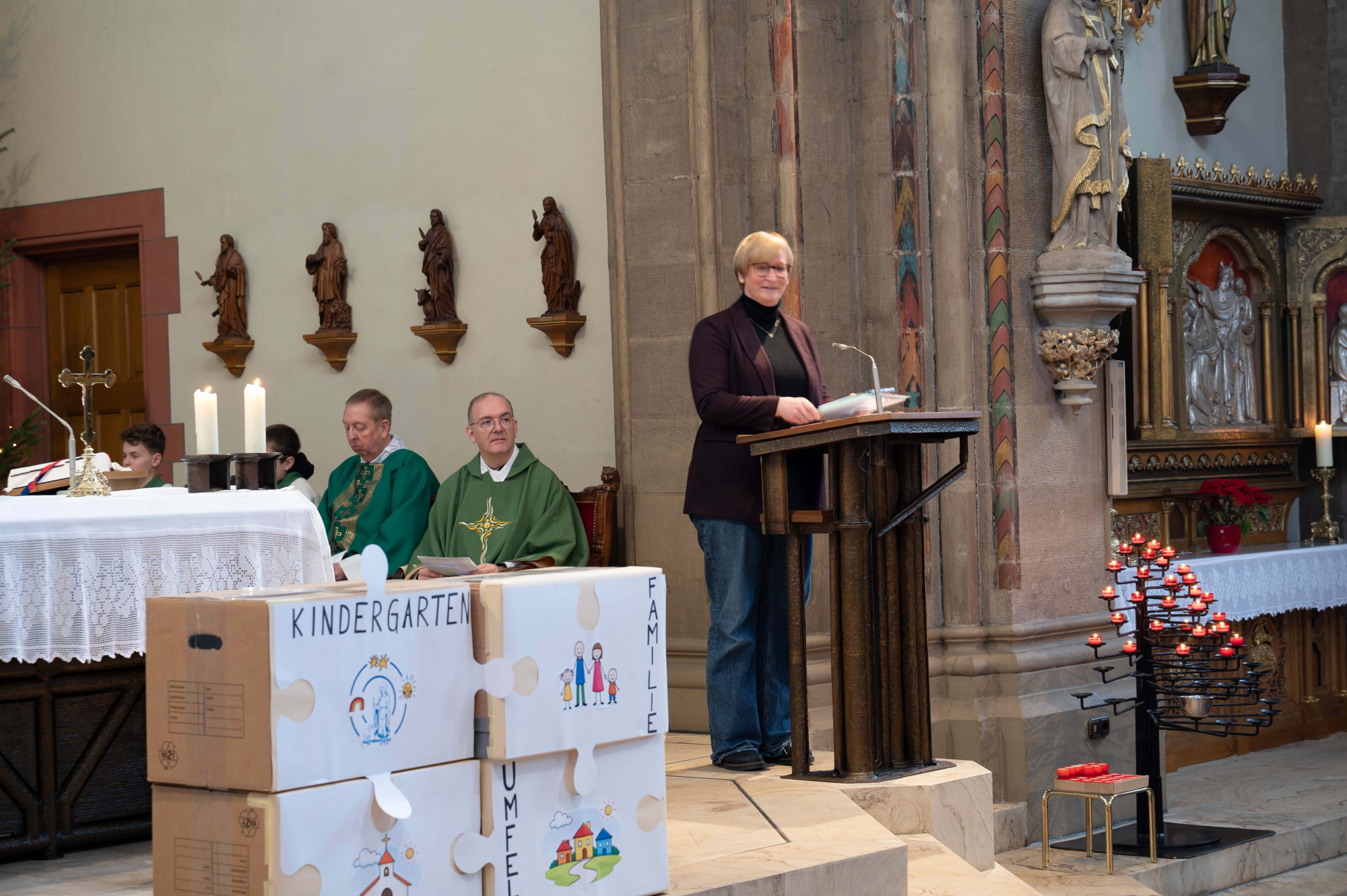 Die Übergabe der 400. Zertifizierung fand im Rahmen eines Familiengottesdienstes in der St. Lambertuskirche in Castrop-Rauxel statt, den Pastor Dietmar Walter leitete. Kinder, Familien, Mitarbeitende der Kita sowie Gäste aus Gemeinde und Umfeld gestalteten den Gottesdienst lebendig mit und machten deutlich, was Familienpastoral im Alltag bedeutet. Besonders eindrucksvoll zeigten die Kinder der Kita St. Rochus in einer symbolischen Aktion ihr Verständnis von Gemeinschaft: Wie Puzzleteile griffen Gemeinde, Kita, Familien und Sozialraum ineinander, stützten sich gegenseitig und ergänzten einander.