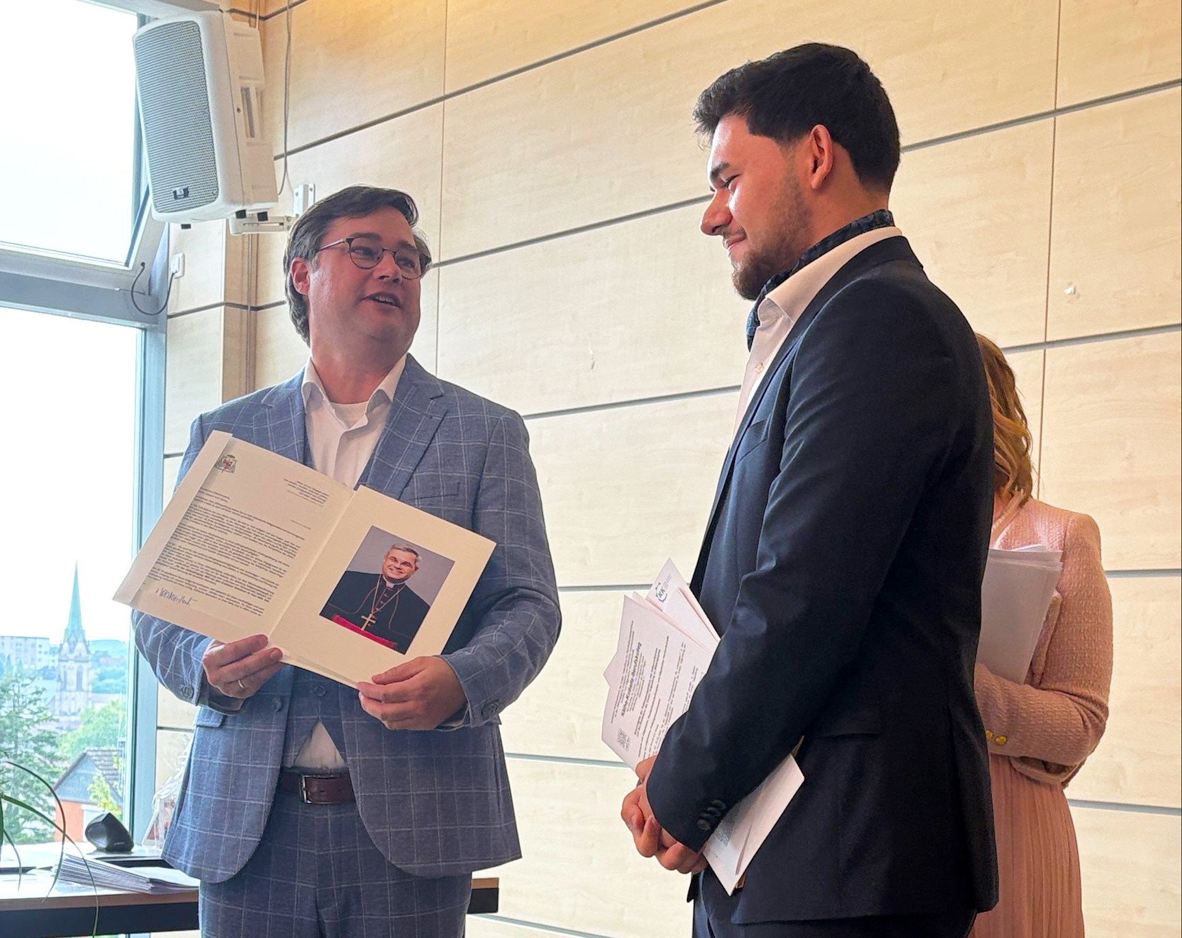 Ein ausgezeichneter Absolvent ist auch Ahmet-Arif Aksoy, ehemaliger Schüler am Käthe-Kollwitz Berufskolleg der Stadt Hagen. Besonders bemerkenswert: Ahmet-Arif hat als muslimischer Schüler als Gast am katholischen Unterricht der Schule teilgenommen und in der mündlichen Abitur-Prüfung ein herausragendes Ergebnis erzielt. „Wir freuen uns, wenn auch junge Menschen anderer Religionszugehörigkeit das Fach Katholische Religionslehre als Möglichkeit erleben, sich vertieft mit Fragen nach den großen Fragen des Lebens zu beschäftigen. Die Rolle der Religionen im Weltgeschehen ist ein wichtiger Inhalt des Faches. Perspektiven aus anderen Religionen empfinden wir dabei als absolut bereichernd“, freut sich Dr. Dennis Lewandowski.