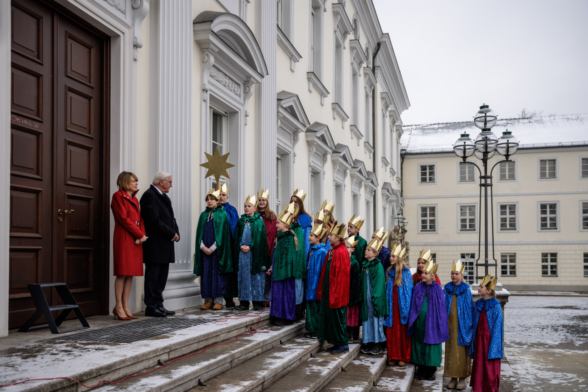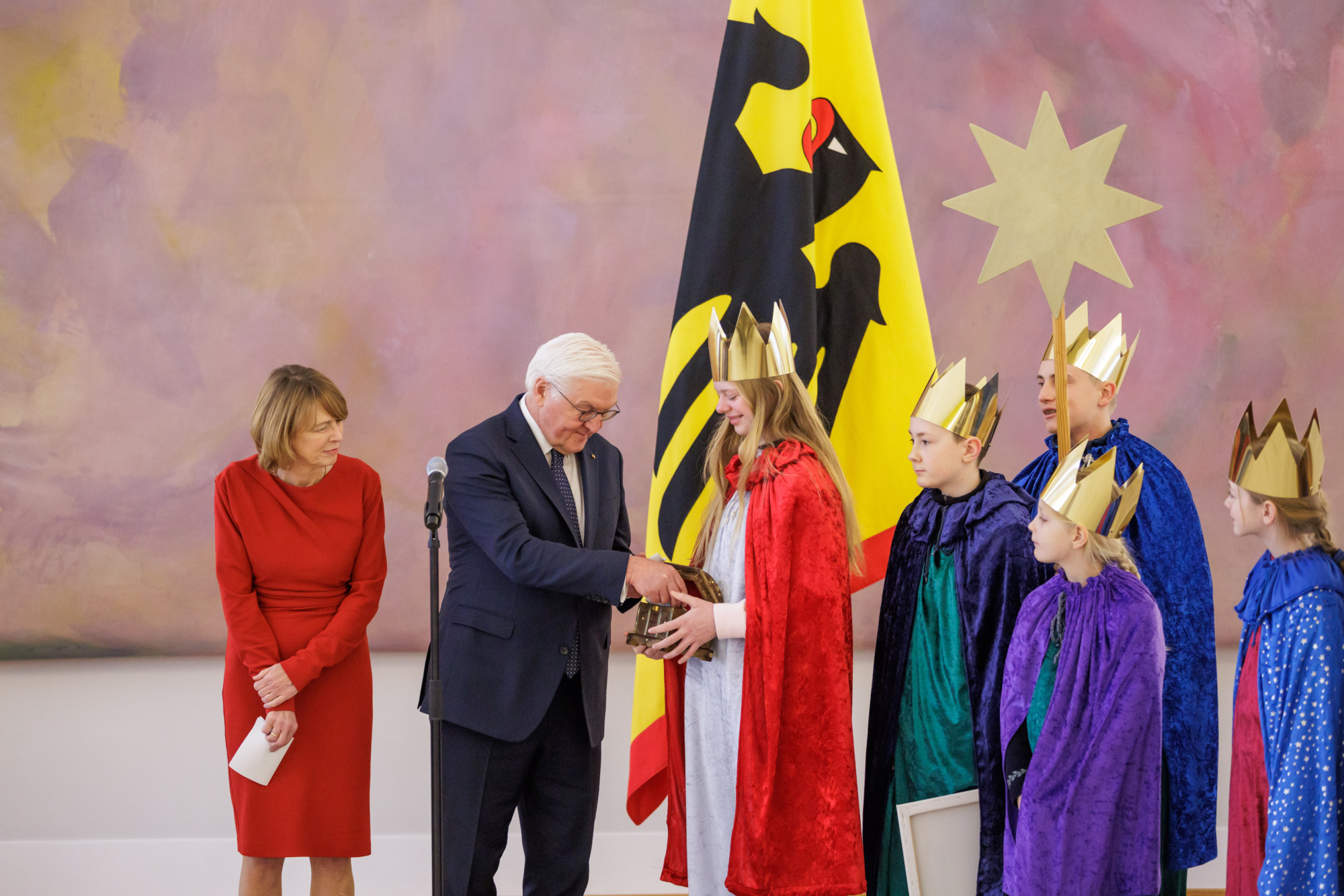 „Meine Frau und ich, wir begleiten die Sternsingeraktion schon seit vielen Jahren. Und wir fanden, dass das was ihr tut, zu wenig Öffentlichkeit erfährt“, sagte Bundespräsident Steinmeier in Richtung der 20 Majestäten. „Und deshalb haben die Sternsinger in diesem Jahr eine ganz prominente Erwähnung gefunden in der Weihnachtsansprache des Bundespräsidenten. Einerseits, weil ich euch herzlich danken will und andererseits, weil ich finde, dass das, was ihr jedes Jahr tut, ohne Aufforderung und ohne bekannt zu sein, viel mehr öffentliche Wertschätzung und Anerkennung verdient als das in den vergangenen Jahren der Fall war“, lobte Steinmeier das Engagement der Kinder und Jugendlichen.