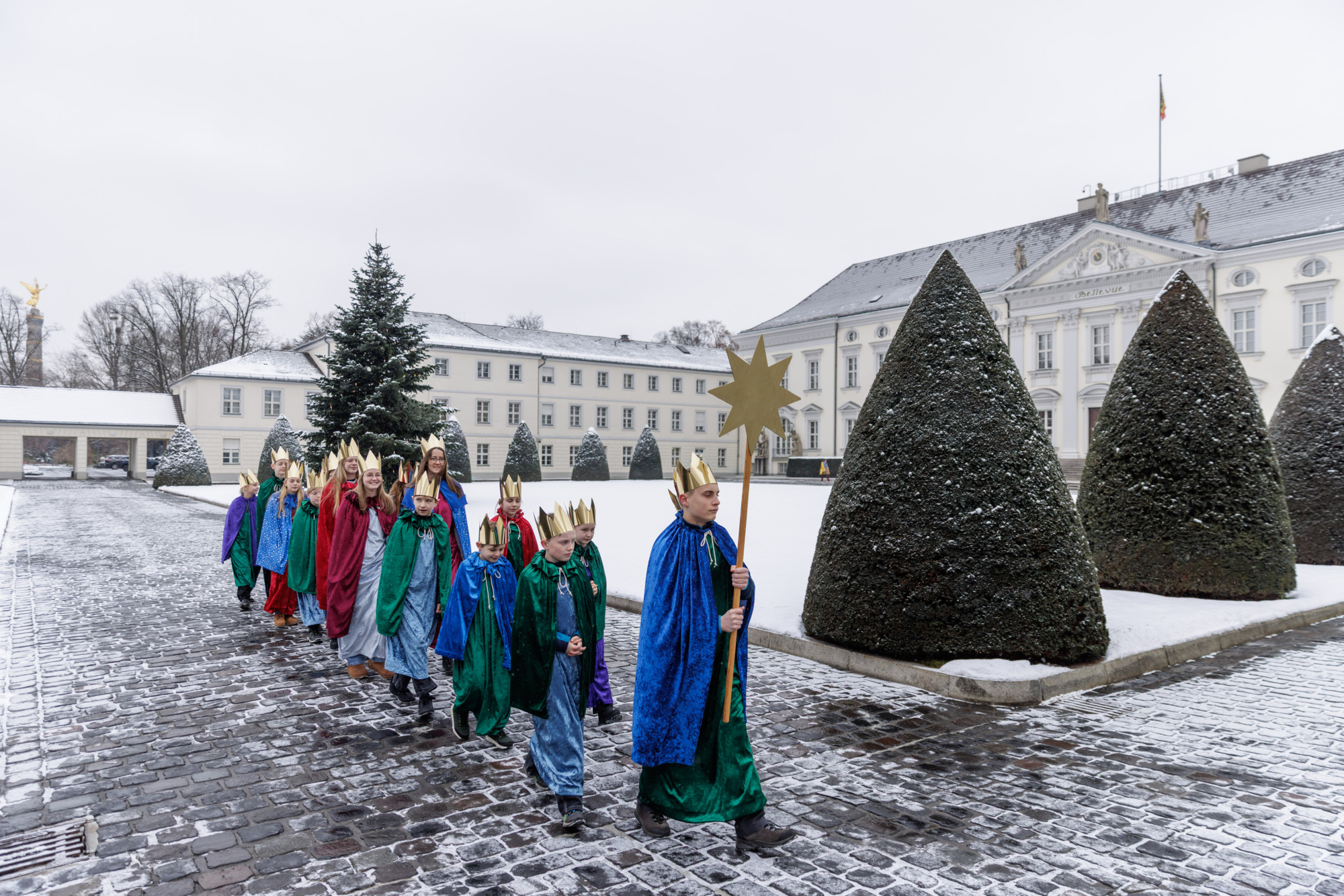 Um 11 Uhr schrieben die Königinnen und Könige aus dem Erzbistum Paderborn den Segen „20 * C + M + B + 26 – Christus mansionem benedicat – Christus segne dieses Haus im Jahr 2026“ an das große Portal des Schlosses. Die elf Mädchen und neun Jungen aus der Pfarrei St. Ewaldi in Dortmund-Aplerbeck waren stellvertretend für alle engagierten Königinnen und Könige, die in diesen Tagen deutschlandweit Spenden für benachteiligte und Not leidende Kinder in aller Welt sammeln, nach Berlin gereist.