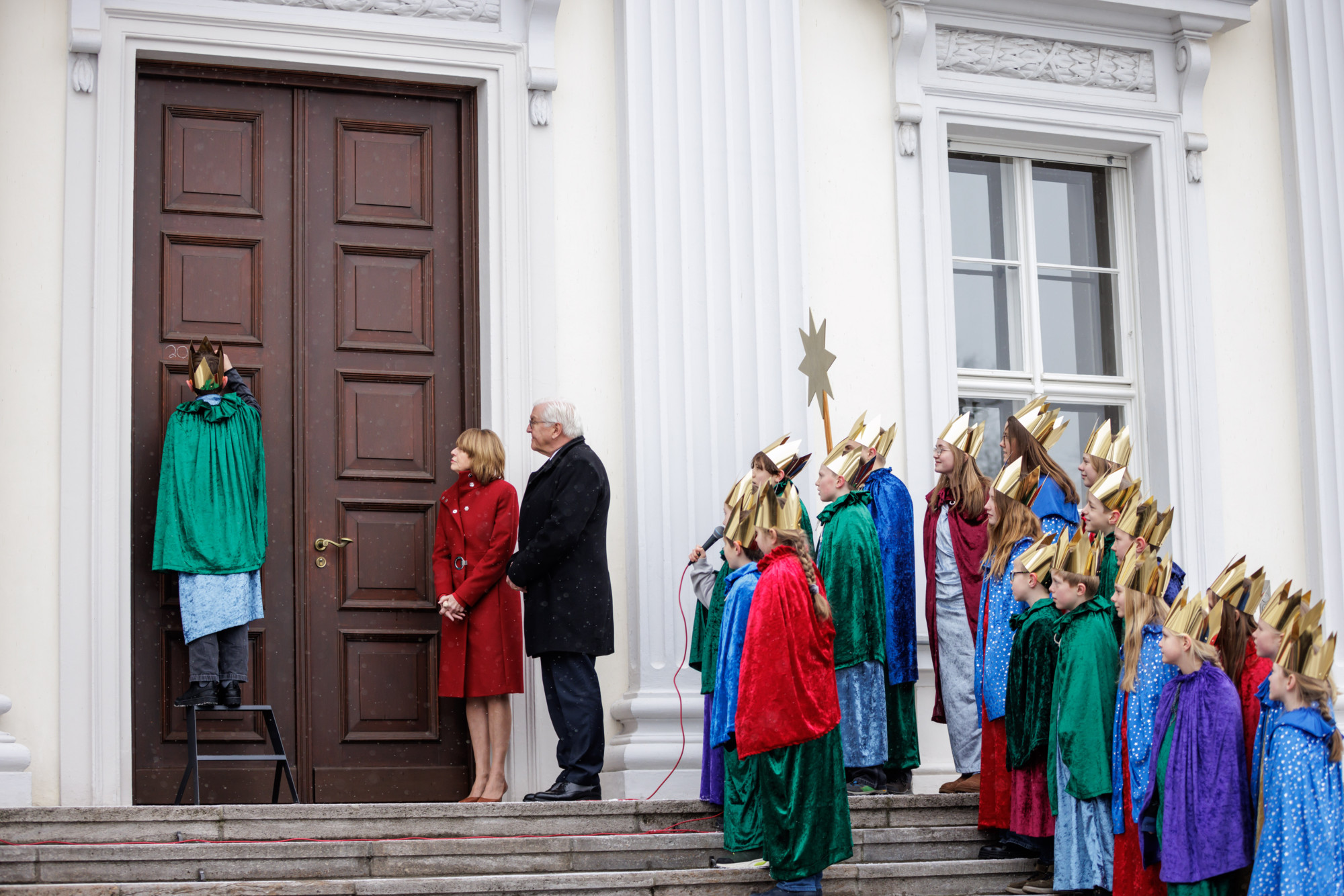 Zu Beginn des Empfangs am Dienstagvormittag klopfte Sternsinger Samuel an das große Schlossportal. „Herr Bundespräsident, die Sternsinger sind da“, läutete der 13-Jährige den Empfang ein, und Johannes (12) schrieb mit weißer Kreide den Segen an das Schlossportal. „Wir bringen den Segen, dass Gott Sie begleite, und hoffen, Sie stehen an unserer Seite für so viele Kinder in anderen Ländern, die arbeiten müssen. Das wollen wir ändern“, trug Sternsinger Timon (12) den dazu passenden Segensspruch vor.