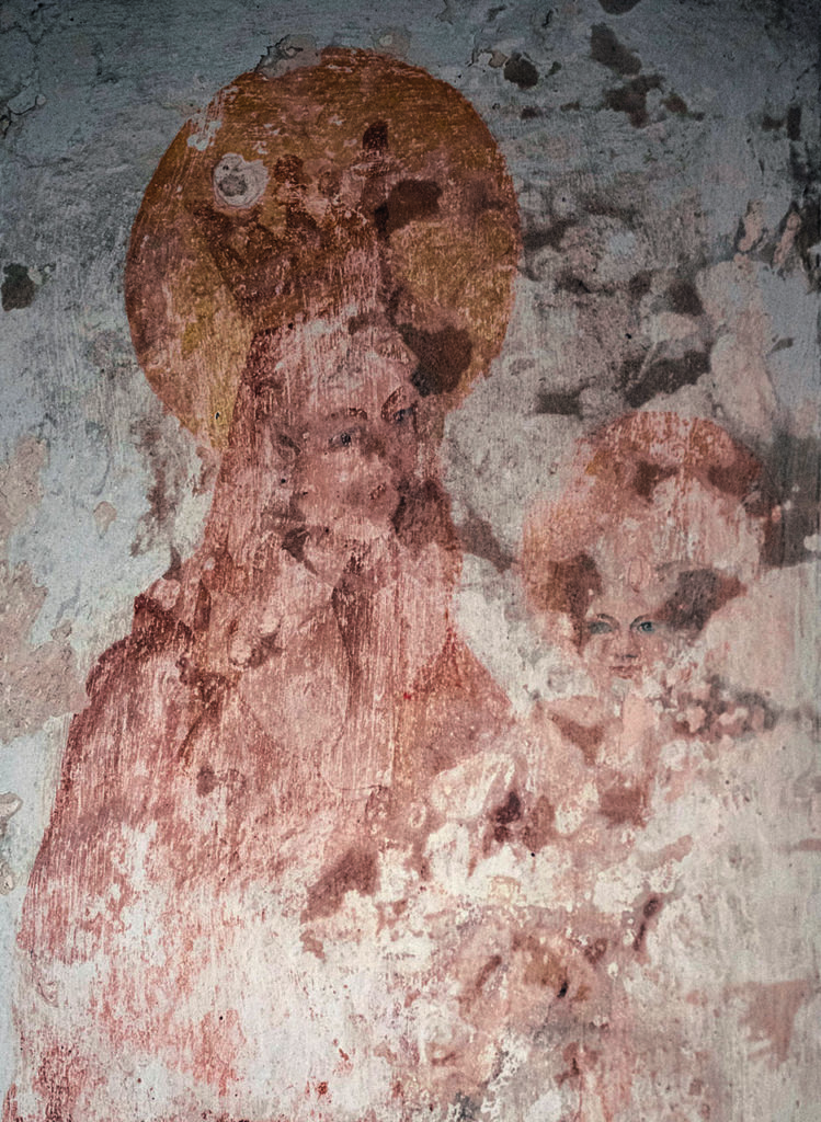 Dörenhagen. Vor mehr als 400 Jahren hat ein Künstler Maria in die Nische der Sakristei gemalt: Das Gesicht einer Frau unter einem Heiligenschein und einer Krone ist auch heute noch zu erkennen. Rote Farbe vom Schleier ist über das Antlitz und den Oberkörper gelaufen. Marlies Heimann steht vor dem Wandbild und fragt: „Sehen Sie das Kind?“ Der Jesus ist nicht leicht zu finden, doch auf dem Foto sticht der Kopf mit den intensiven blauen Augen sofort aus den verblassten Farben heraus – ein künstlerisches Überraschungsmoment und ein mysteriöses Detail des Bildes. Der Künstler hat kein Babygesicht gemalt, das war damals nicht üblich, sondern das Gesicht eines Kindes, das den Betrachter aufmerksam mustert.