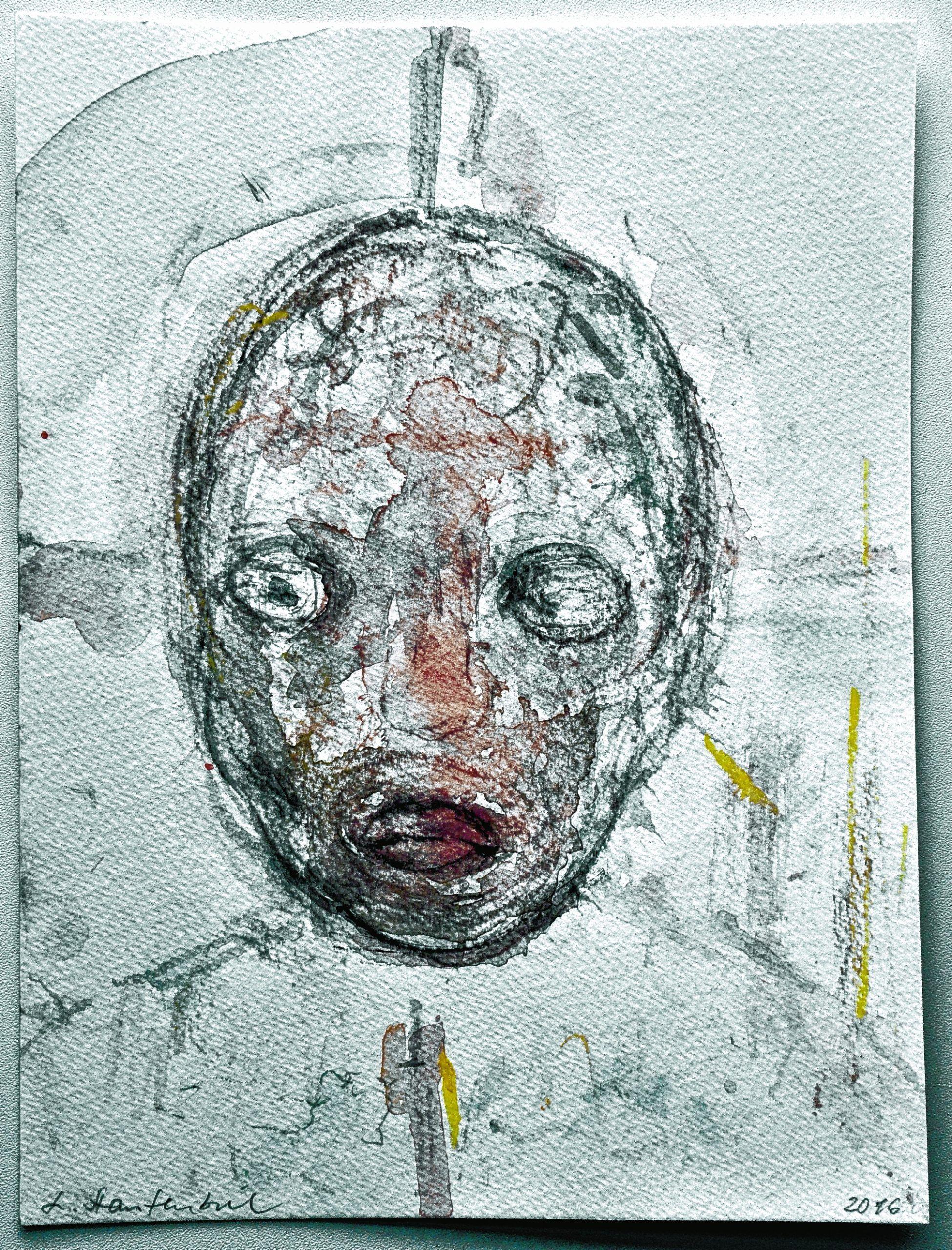 Das abgedruckte Bild (Format 24 x 18 cm) ist kein Schädel, sondern ein Kopf. Das ist ein Unterschied. Ein Kinderkopf, eine Kindermumie oder ein Christusknabe womöglich? Immerhin sind doch ein Kreuz und sogar ein Heiligenschein angedeutet. Das hat Staufenbiel in seinem Bild noch nicht gesehen. „Möglich“, sagt er. Einen Kinderkopf allerdings, ja, den erkennt er auch. „Und es ist kein glückliches Kind.“ Das Motiv dieses Kinderkopfes taucht öfter in seinen Bildern auf, er weiß gar nicht genau, woher der kommt. Wenn man ihn fragt, was er sieht, wenn er das Bild anschaut, antwortet er: „Ich sehe ein gelungenes Aquarell.“ Beim Aquarell wisse man nie, wie es aussehen wird, wenn alles getrocknet ist.