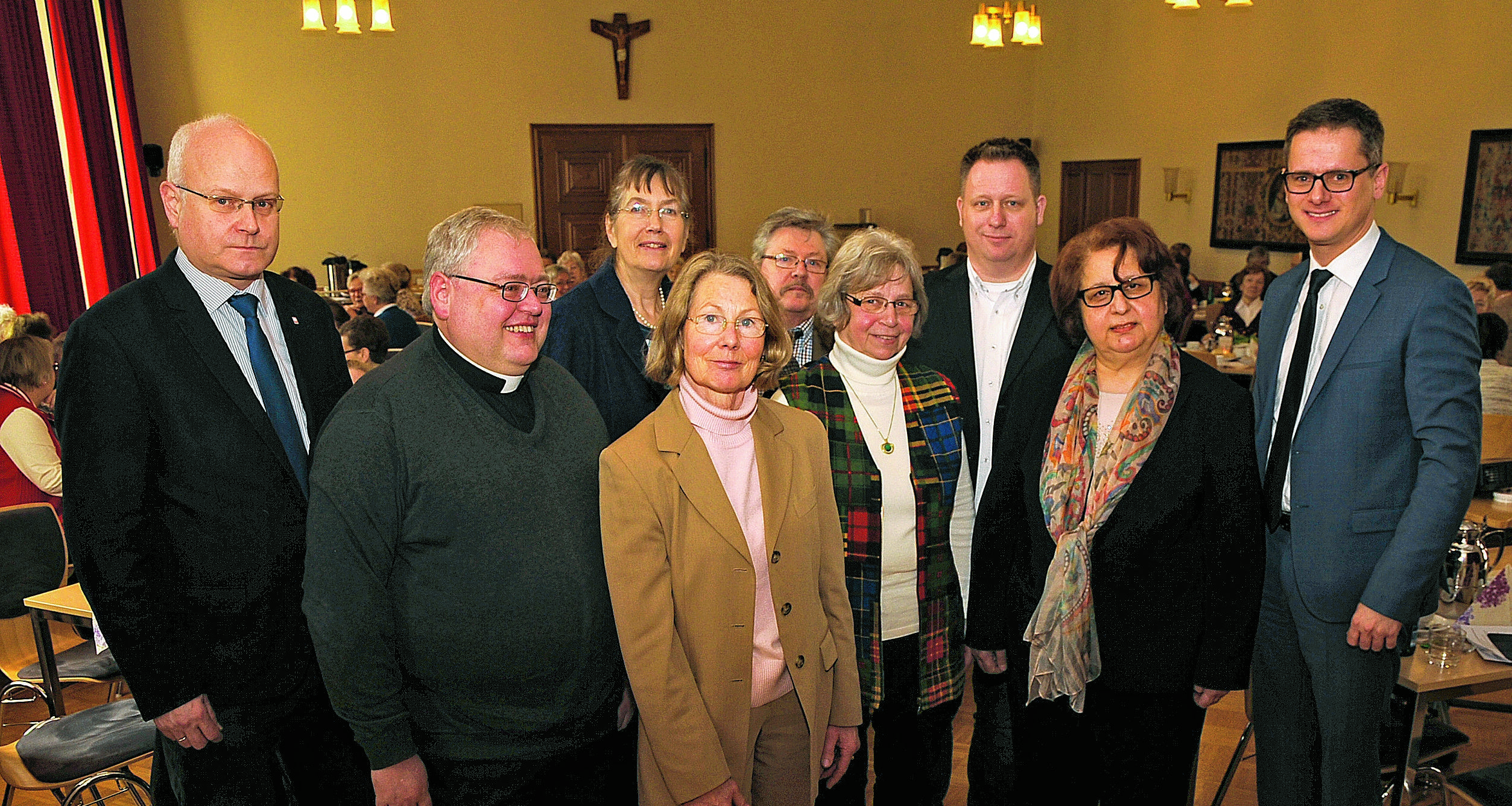 Reden über Altersarmut: Der Vorstand der Caritaskonferenzen im Dekanat mit Gästen. (von links) Patrick Wilk (Caritasvorstand Paderborn), Pfarrer Bernhard Henneke (geistlicher Beirat), die Vorsitzende Maxine Odenbach, Elke-Maria Kickum, Raimund Witter, Theresia Brinkmann, Karsten Henschel (Koordinator für Caritas), Claudia Hanna und Carsten Linnemann