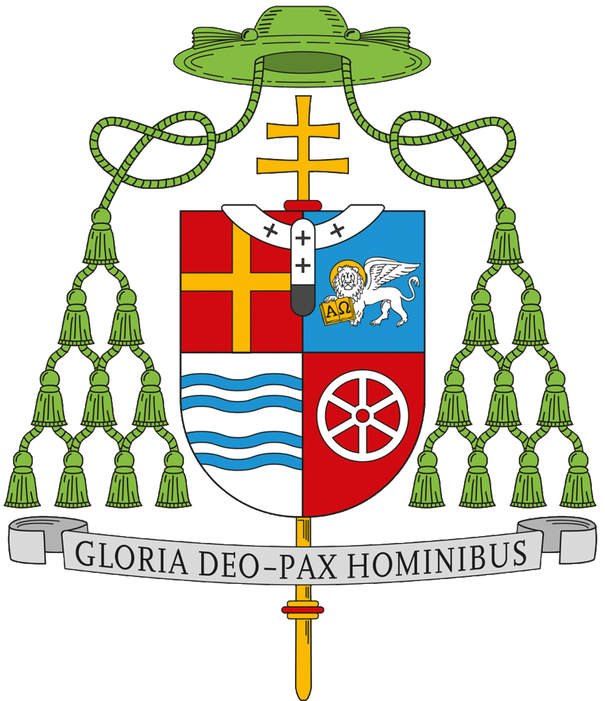 Typische heraldische Nebenstücke umrahmen das Wappen, so der breitkrempige Klerikerhut (Galero) mit Quasten (Fiocchi). Die Farbe von Hut und Quasten sowie deren Anzahl zeigen den Rang an: Das Wappen eines Erzbischofs hat einen grünen Hut und 20 grüne Quasten. Das doppelte Kreuz hinter dem Wappenschild zeigt ebenfalls den Rang als Erzbischof an.