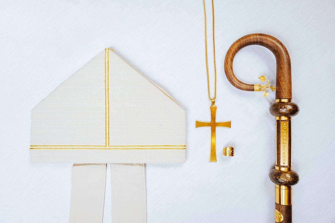 Paderborn (pdp). Der Hirtenstab, das Brustkreuz, der Ring sowie die Mitra sind in der katholischen Kirche zeichenhafte Attribute eines Bischofs. Sie werden als Pontifikalien oder Insignien bezeichnet. Paderborns neuer Erzbischof Dr. Udo Markus Bentz wurde am 10. März 2024 in sein Amt eingeführt. Seine Pontifikalien bringt er aus seinem Heimatbistum Mainz mit, wo er bisher Weihbischof war. Einige erhalten durch eine besondere Umgestaltung eine Paderborner Prägung. In seinem bischöflichen Wappen verbindet Dr. Udo Markus Bentz seine Heimatdiözese Mainz mit seiner neuen Heimat Paderborn.