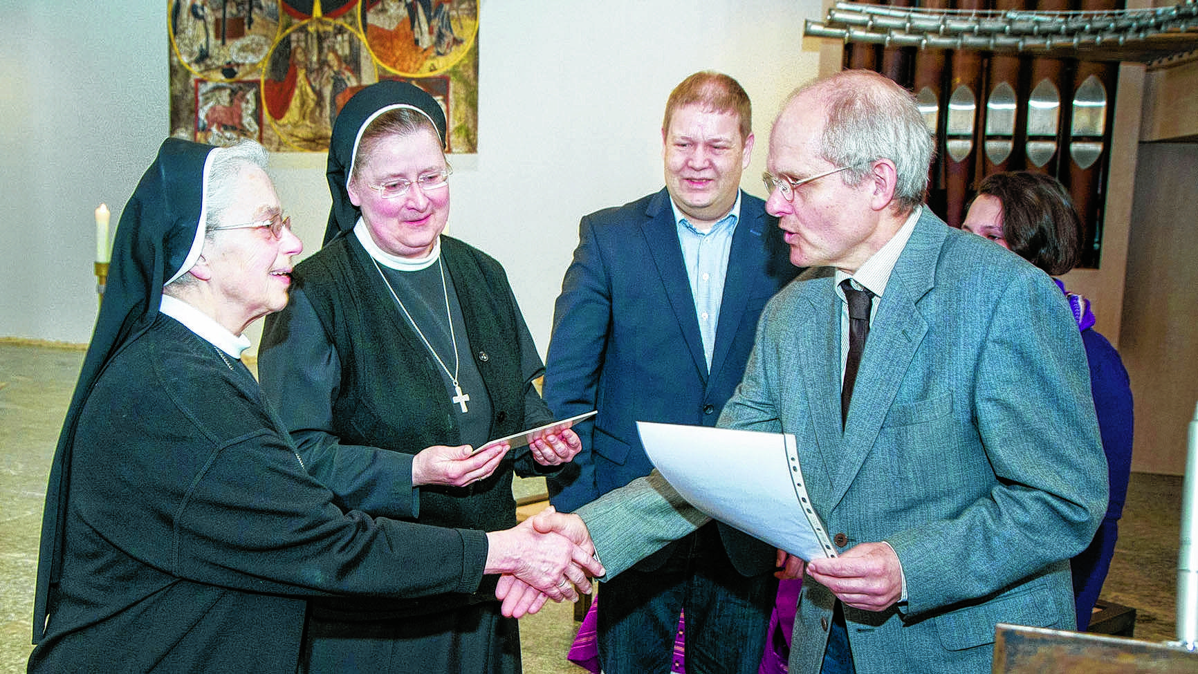 Beim anschließenden Empfang bedankten sich Provinzoberin Schwester Johanna Guthoff und Provinzassistentin Schwester Maria Martha Horstschräer für die ausgesprochene Wertschätzung. Schwester Johanna versprach: „Die soll jetzt am Klostereingang, aber auch im Gästebereich sichtbar werden. Damit wir das Thema im Bewusstsein halten, weiter daran arbeiten und vielleicht auch andere inspirieren.“
