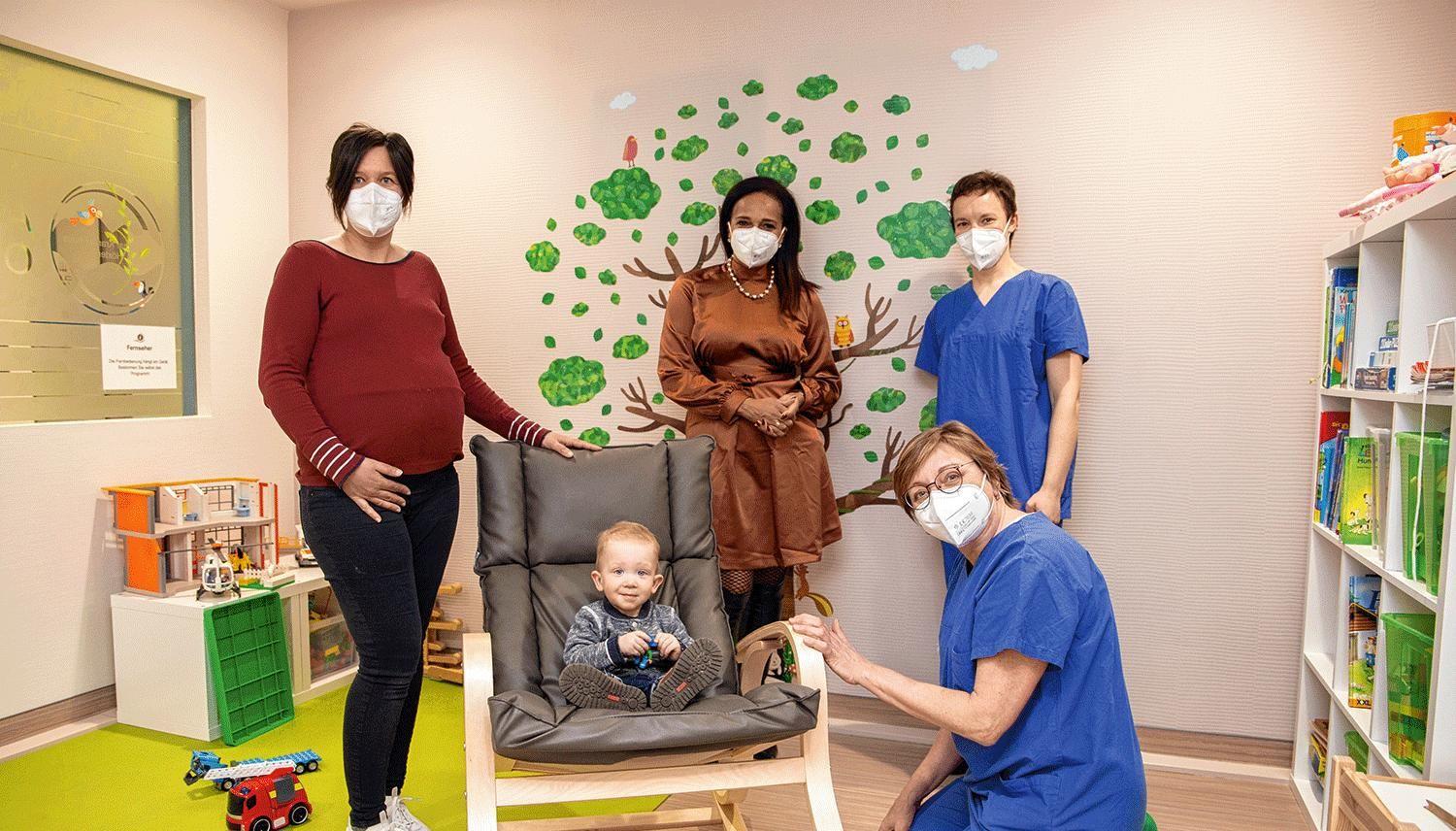 Im Ambulanten OP-Zentrum des St.-Ansgar-Krankenhauses der KHWE ist ein neuer Wartebereich für Kinder entstanden. Darüber freuen sich (von links): Diana Weber mit Malte, Standortleiterin Constance Jow, Helene Tammert und (vorne) Annette Kriegel (Leitung OP-/Anästhesie-Pflege KHWE). (Foto: KHWE)