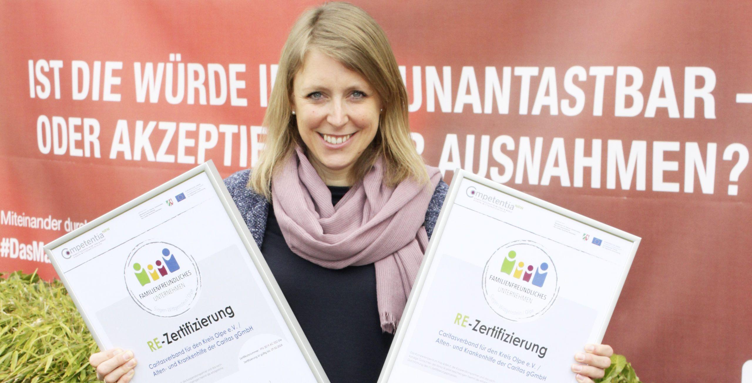 Aufgrund der familienfreundlichen Personalpolitik wurde die Caritas Olpe nun als „Familienfreundliches Unternehmen“ rezertifiziert. „Die erneute Bestätigung des Gütesiegels verdeutlicht die Nachhaltigkeit, mit der wir unsere Mitarbeitenden bei der Vereinbarkeit von Beruf und Familie unterstützen“, sagt Karina Reimann aus der Geschäftsleitung und selbst Mutter zweier Kinder. Auch andere Auszeichnungen etwa als „Great place to work“, als „großartiger Arbeitsplatz“, bestätigen die Caritas. „Auch in Zukunft und gerade in Corona-Zeiten wollen wir unsere Mitarbeitenden bestmöglich begleiten und eine bedarfsgerechte Weiterentwicklung familienfreundlicher Angebote garantieren“, verspricht Reimann. Neben flexiblen Arbeitszeiten und unterschiedlichen Teilzeitmodellen gehöre auch die Möglichkeit zum mobilen Arbeiten zum festen Bestandteil der Caritas-Unternehmenskultur. Die Vertreterinnen und Vertreter des Verbandes versprechen: „Auch in Bereichen, in denen sich die Flexibilisierung der Arbeitszeiten schwierig gestaltet– wie z.B. in der Pflege– wollen wir im Rahmen unserer Möglichkeiten in der Dienstplangestaltung mehr auf die Bedürfnisse unserer Mitarbeitenden eingehen.“