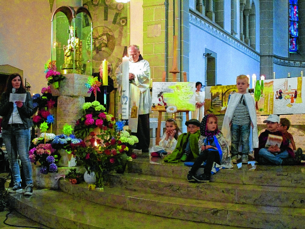 Für die musikalische Begleitung der Messe sorgte die Band „Stromschlag“, die selbst aus 10- bis 14-jährigen Jugendlichen besteht und sehr zur positiven Stimmung beitrug. Aber auch die ganz Kleinen aus den Kitas trugen zum gelungenen Programm bei: Kinder der Kita St. Peter führten vier Bibelstellen aus dem Leben Jesu vor. Die Verkündigung der Frohen Botschaft oder die Darstellung von Jesus als Zwölfjährigem im Tempel begeisterten Erwachsene und Kinder gleichermaßen.