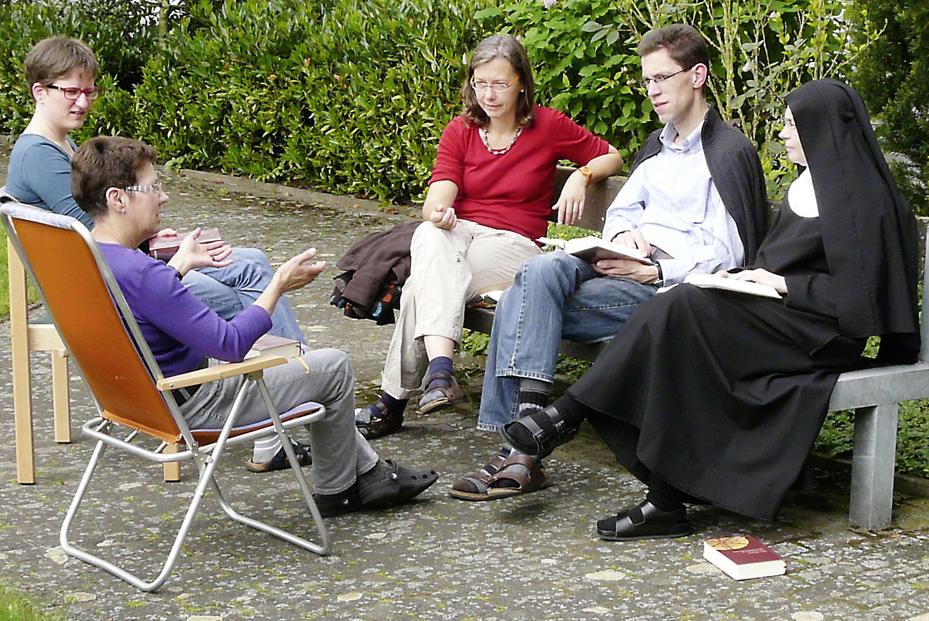 Gesprächsrunde im Klostergarten: Das Jahresprogramm der Benediktinerinnen in Rietberg-Varensell für Gäste ist vielfältigt und reicht von Themen-Kursen bis zu Familienwochenenden. Foto: Abtei Varensell