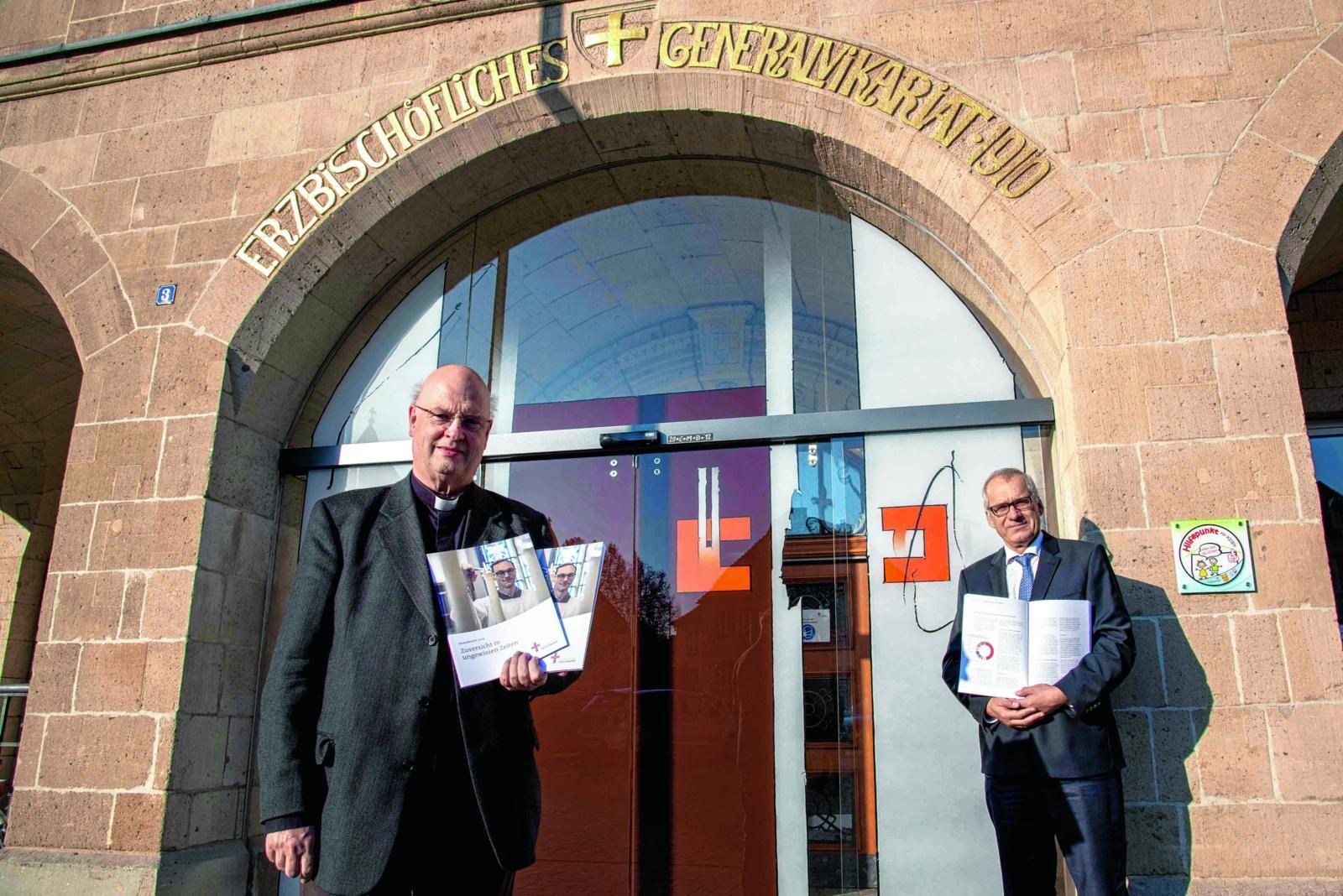 Generalvikar Alfons Hardt (l.) und Finanzchef Dirk Wummel präsentieren den Finanzbericht 2019 des Erzbistums. Foto: