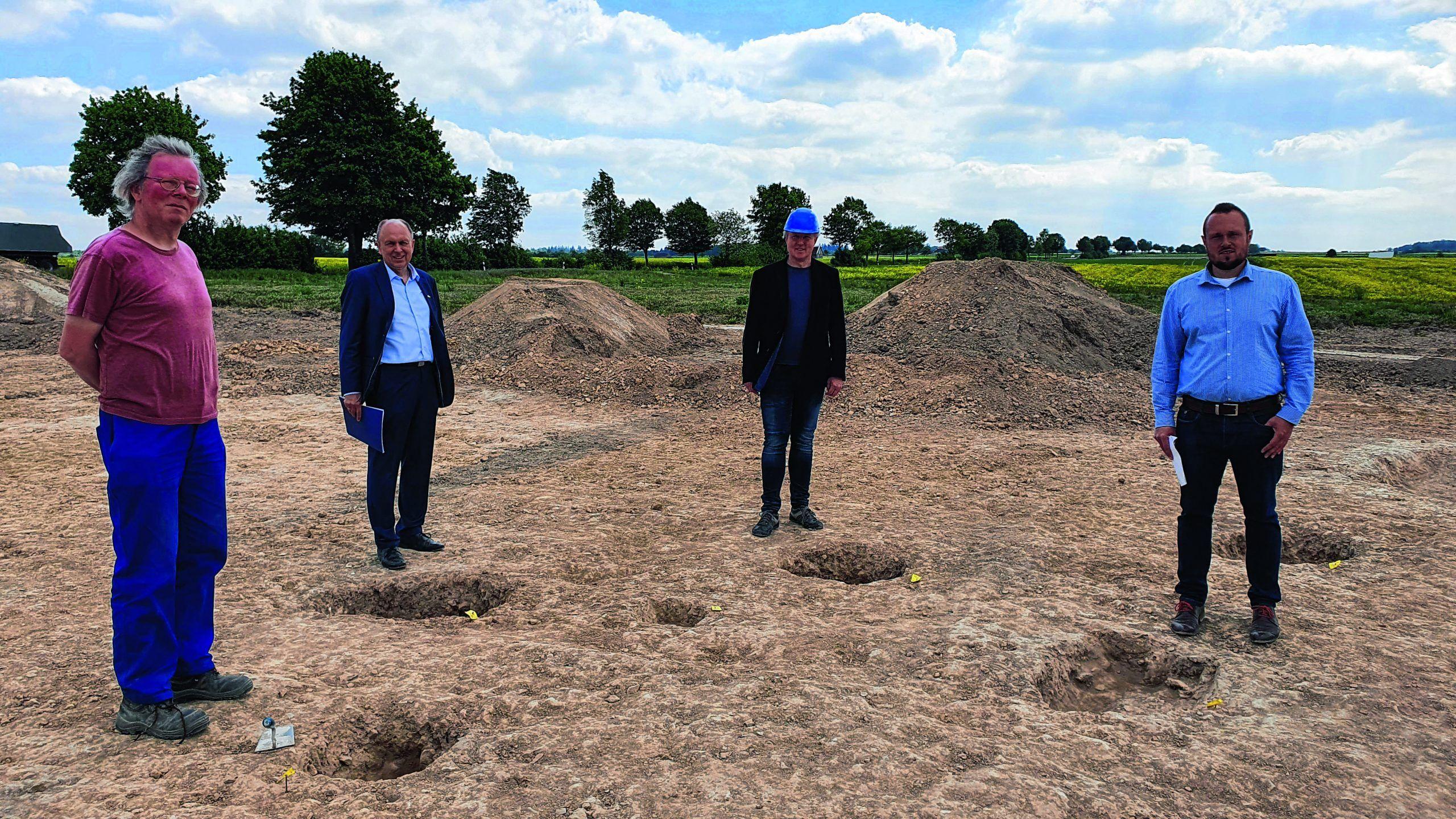 Die Archäologen Dr.Wolfgang Messerschmidt (links) und Dr.Sven Spiong (2.v.r.) zeigen Bürgermeister Christoph Rüther (2.v.l.) und Bauamtsleiter Sebastian Döring die Grabungen. Foto: Jonas