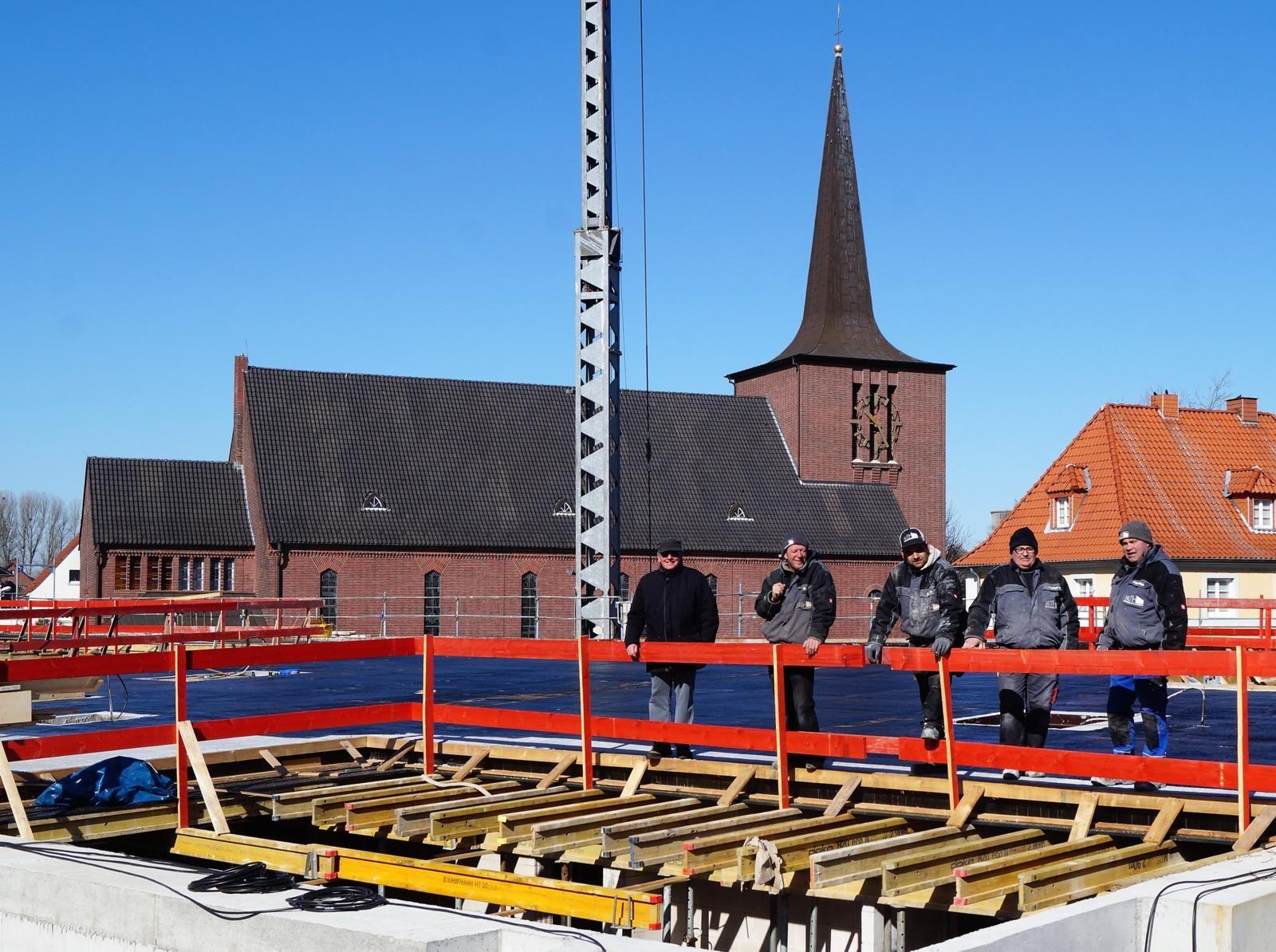 Kirchenvorstandsmitglied Günter Rosenhövel freut sich mit den fleißigen Handwerkern über den Baufortschritt. Foto: Körtling