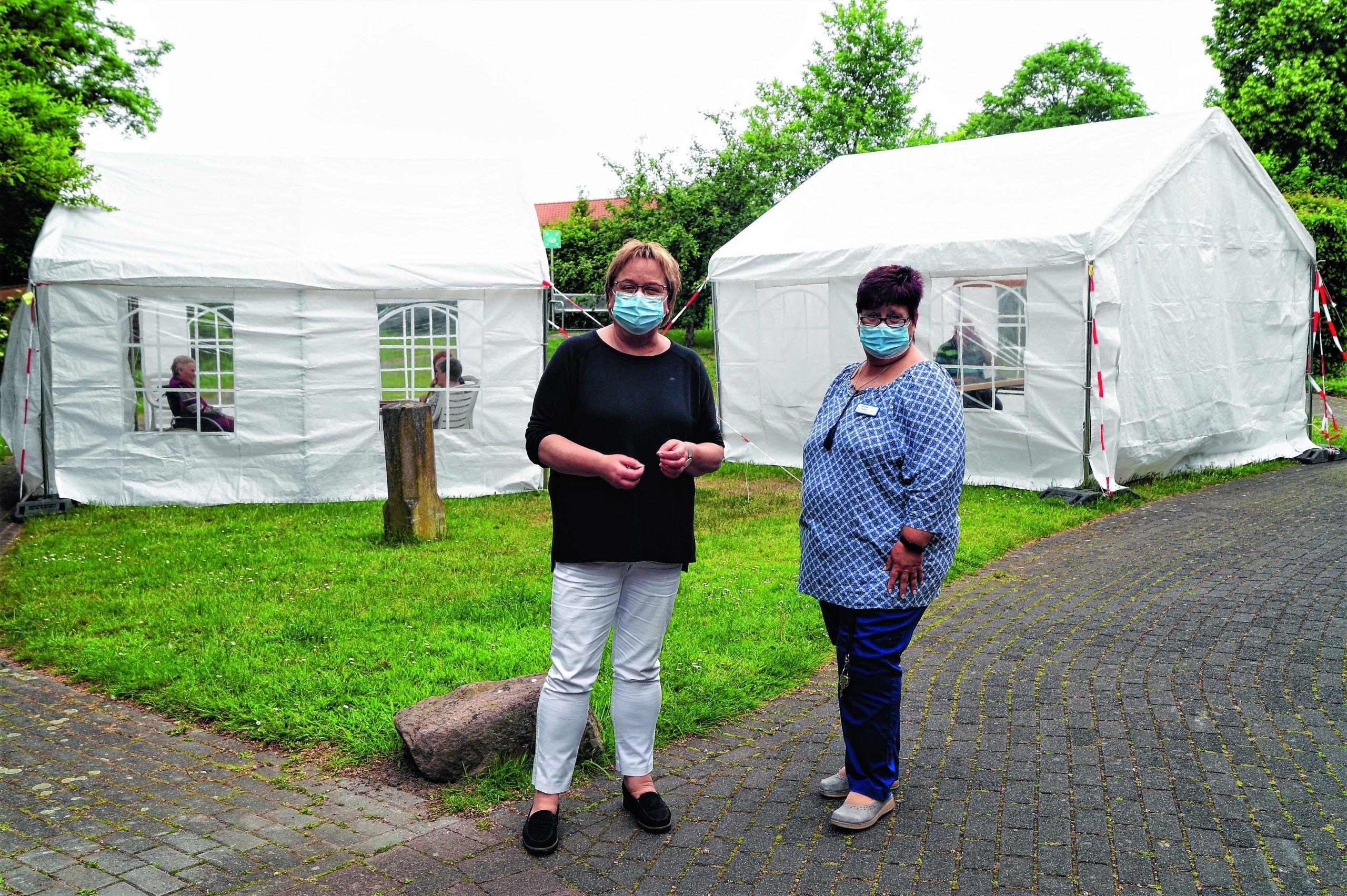 Um das Haus selbst, in dem immer noch Quarantäne herrscht, weiter sicher zu halten, wurden im Garten zwei geschlossene Pavillons mitsamt Tischen, Stühlen und einer transparenten Kunststoff-Abtrennung zwischen Bewohnern und Angehörigen errichtet.