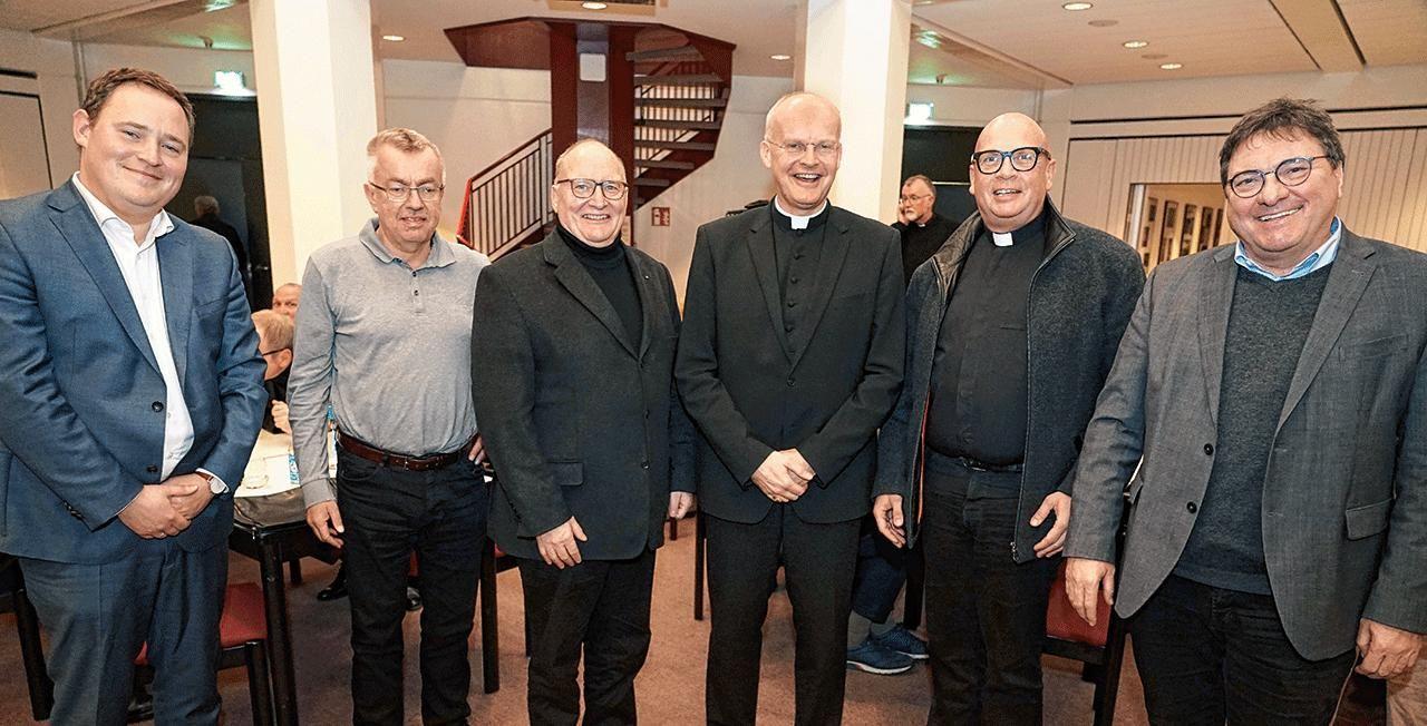 Abend mit Bischof Dr. Franz-Josef Overbeck im Katholischen Centrum (v. l.): Dr. Klaus Klother (Kath. St. Paulus Gesellschaft), Clemens Galuschka (Kath. St. Paulus Gesellschaft), Propst Andreas Coersmeier, Bischof Dr. Franz-Josef Overbeck, Pastor Stefan Tausch (Kath. Forum) und Klaus Bathen (Kath. St. Paulus Gesellschaft). (Foto: Michael Bodin)