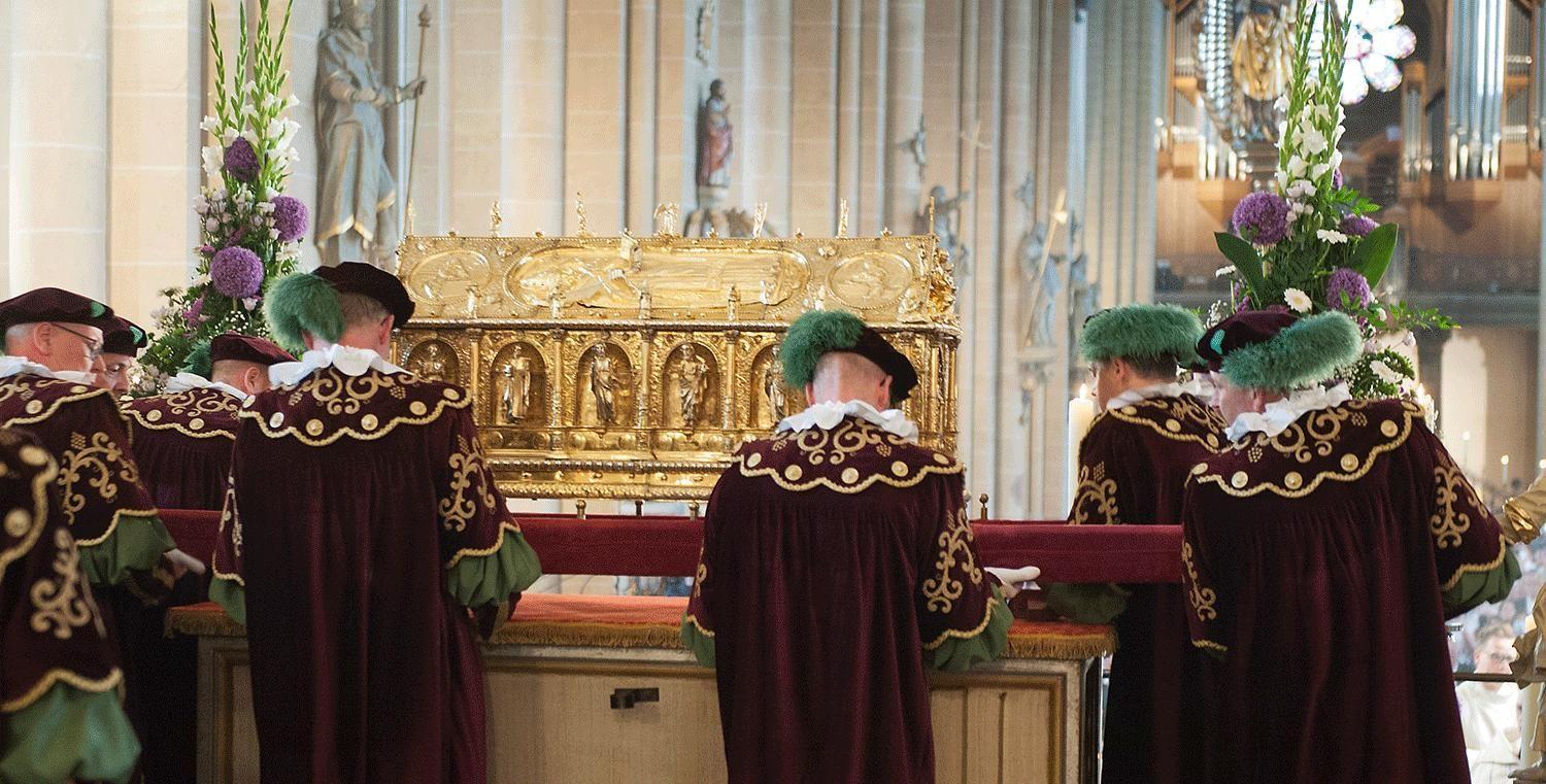Wie schon im vergangenen Jahr kann die Prozession mit dem Schrein zum Rathaus nicht stattfinden. Eigentlich gibt es dort den Segen über die Stadt. Als Zeichen der Verbundenheit spricht daher auch in diesem Jahr der Paderborner Bürgermeister Michael Dreier die Fürbitten. Die erste galt den Flutopfern, eine weitere den Kindern und Jugendlichen, die unter den Einschränkungen der Pandemie besonders gelitten haben.