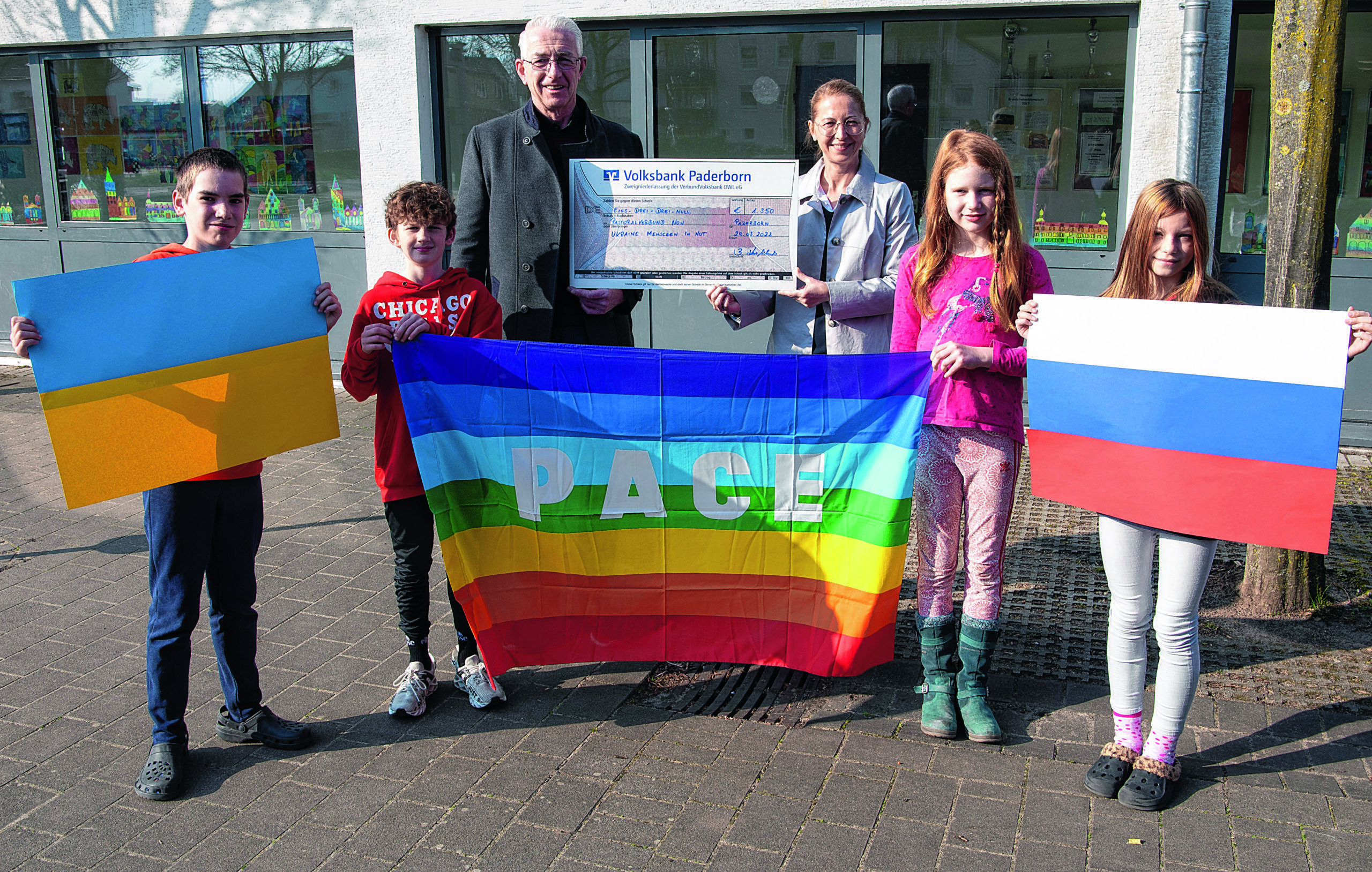 Von der eingesammelten Summe geht die Hälfte an das Westfälische Kinderdorf in Peru. Den Rest haben die Schülerinnen und Schüler bislang immer für sich und ihre eigene Schule verwendet. In diesem Jahr aber ist das anders. Pfarrer Thomas Stolz, Leiter des Pastoralverbundes NOW, konnte aus der Hand der Kinder einen symbolischen Scheck über 1.350 Euro entgegennehmen. Den Zweck ihrer Spende hatten die Kinder beim „Boni-Treff“ – eine demokratische Versammlung der Schülerinnen und Schüler – selbstständig festgelegt: Das Geld ist für die Menschen in der Ukraine bestimmt.