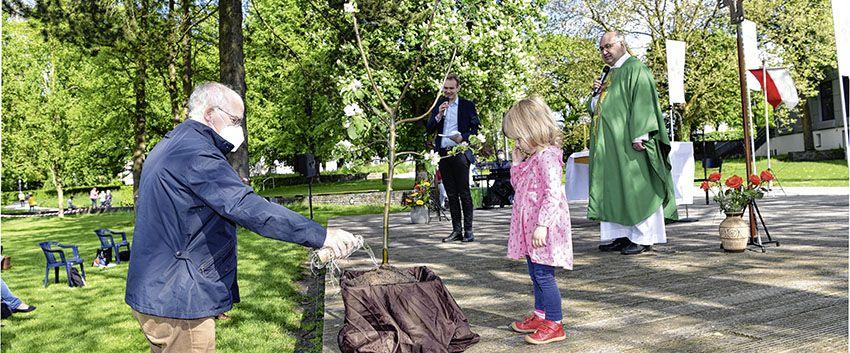 Auf der Bühne im Arminiuspark stand neben dem Altar ein junger Apfelbaum. Während der Messe bedeckten Vertreterinnen und Vertreter aus den neun Pfarrgemeinden die Wurzeln mit Erde aus ihren Heimatorten und gossen den Baum mit Wasser aus heimischen Quellen oder Bachläufen. Als Gegengabe erhielten sie eine Tasche voller Geschenke mit geistiger und körperlicher Wegzehrung, unter anderem die Pastoralvereinbarung, aber auch Süßigkeiten und eine Flasche mit Apfelsaft.