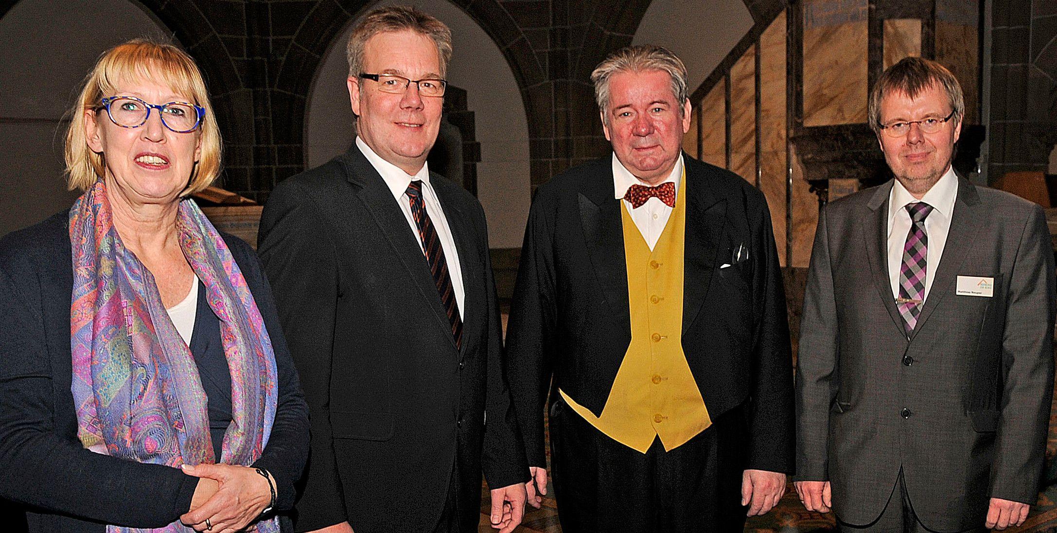 Die Grippe war Thomas Beckmann deutlich anzusehen. Dennoch trat der Cellist in der Christuskirche auf (v. l.): Elisabeth Montag (Vorstand Caritas Lippe), Landessuperintendent Dietmar Arends, Thomas Beckmann und Matthias Neuper (Lippische Landeskirche).