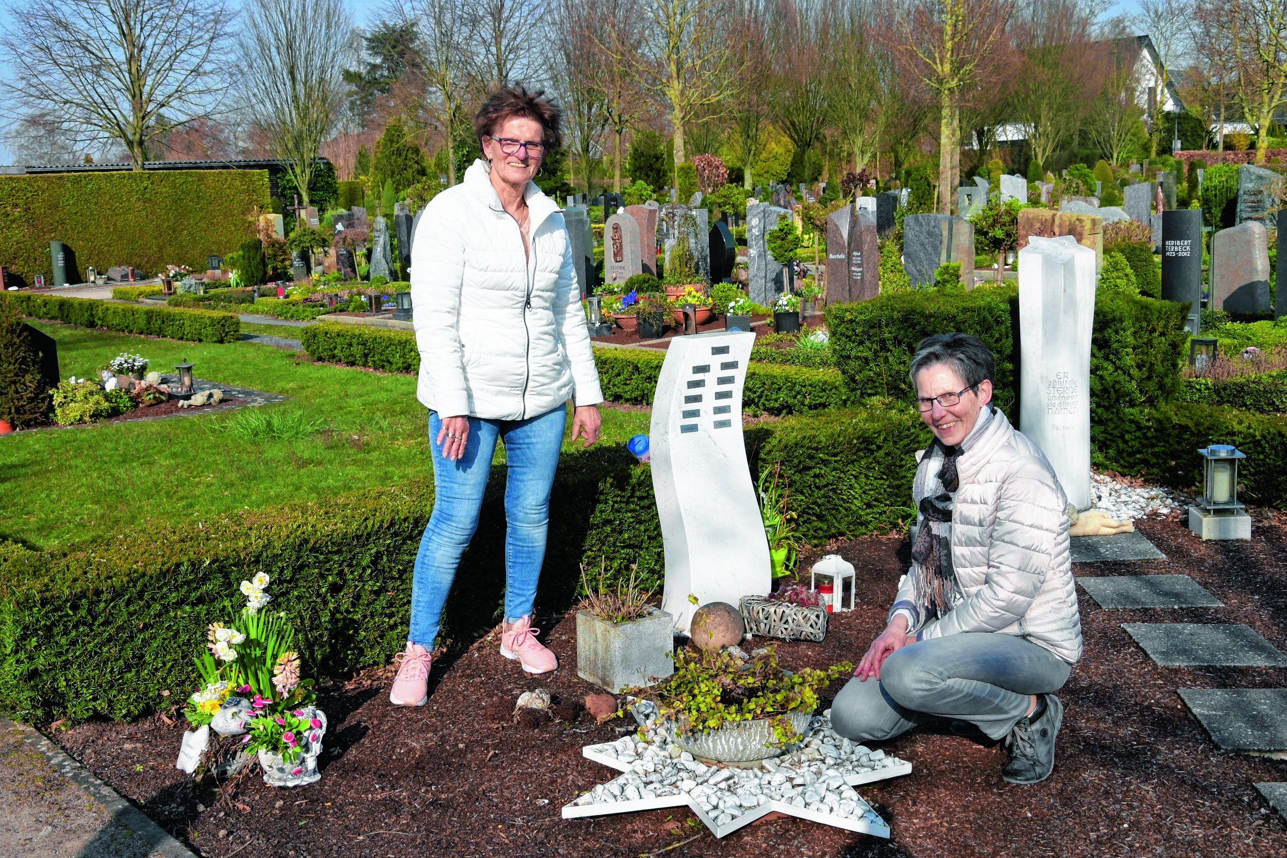 Gudrun Siemund und Klaudia Oesterdiek (von links) kümmern sich in Langenberg ehrenamtlich um das Sternenkinderfeld auf dem kommunalen Friedhof. Auf ihre Initiative wurde das Feld vor elf Jahren angelegt. Beide tragen Sorge dafür, dass die Kinder, die still geboren wurden, einen Ort der Erinnerung bekommen. Foto: Leskovsek