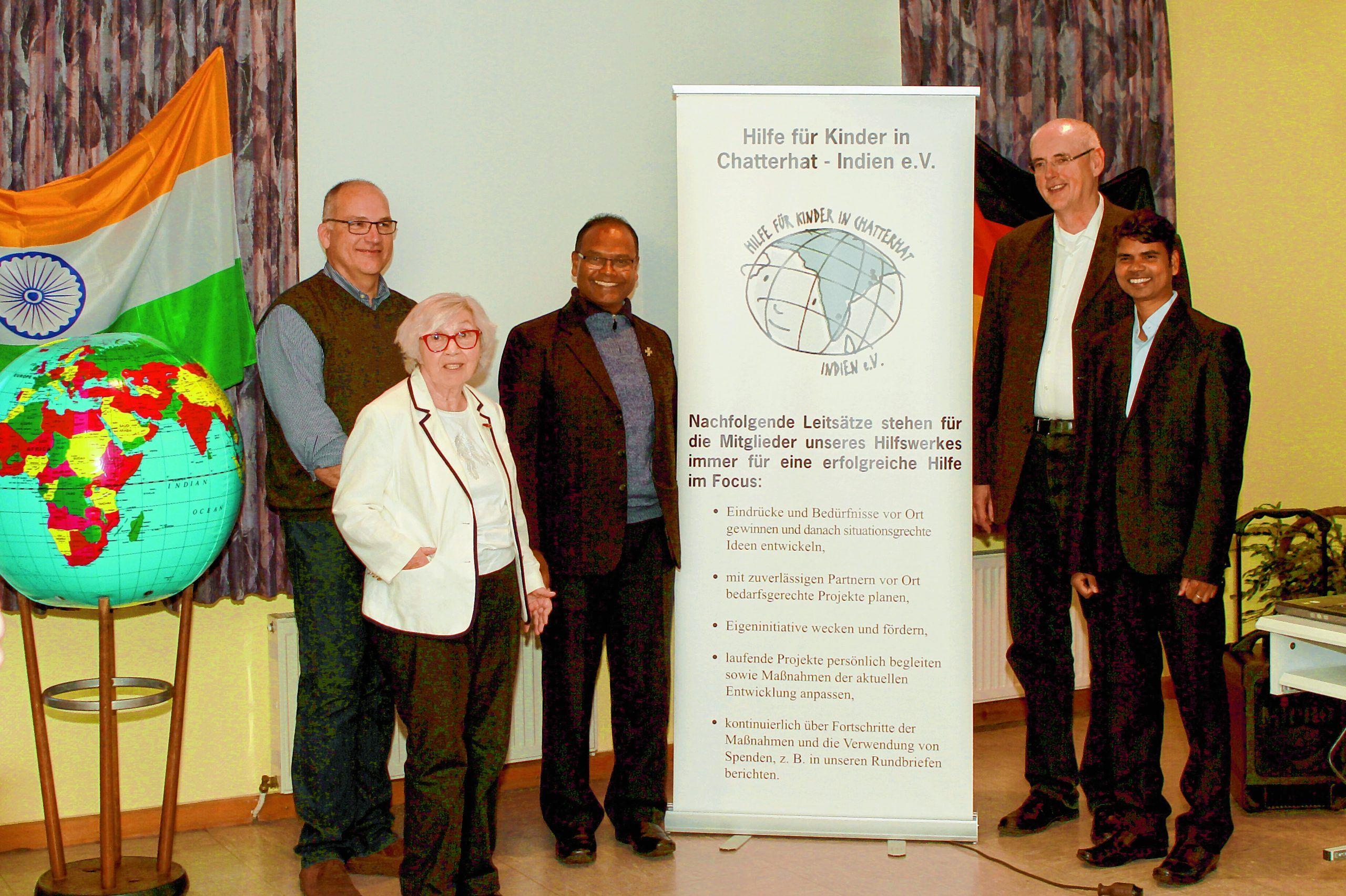 Der Vorsitzende Martin Otto (v. l.) mit dem Gründungsmitglied von „Hilfe für Chatterhat“ Marianne Döring, die eigens zum Jubiläum aus Düsseldorf anreiste, Bischof Vincent Aind, Pfarrer Benno Heimbrodt und Father Niraj Toppo. Foto: Plamper