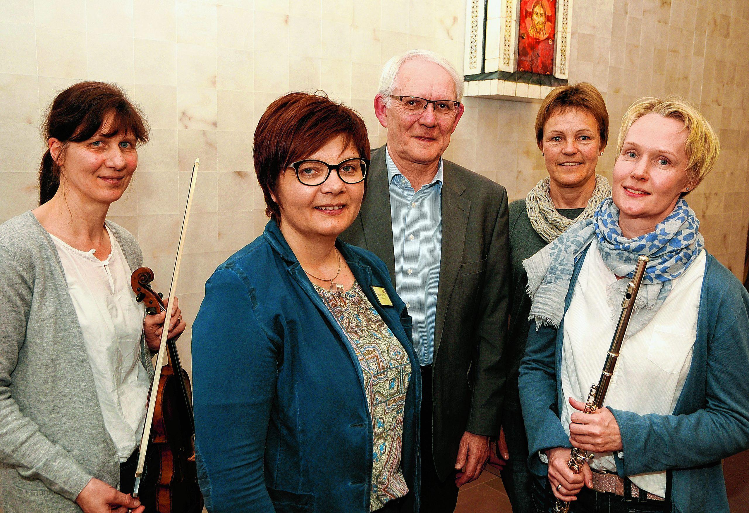 Große emotionale und spirituelle Intensität: Ullrich Auffenberg mit Gastgeberin Ursula Fischer (Mitte), den Musikerinnen Dorothea Mieth (Violine), Laura Fedde (Querflöte) und Roswitha Wening.Foto: Flüter
