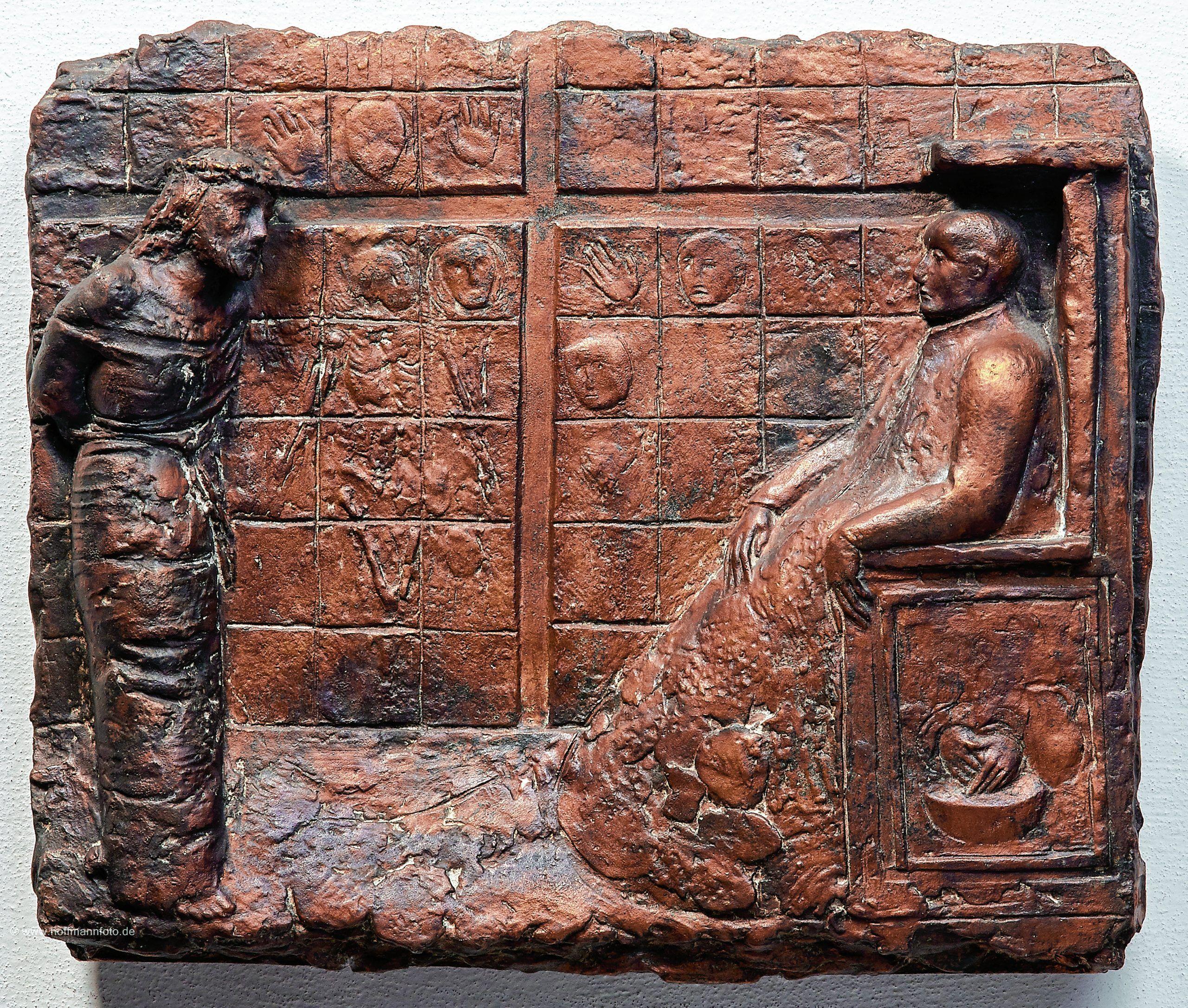Die dargestellte Szene ist bekannt: Jesus wird zum Tod verurteilt. Und wer wer ist, ist auch klar. Der Richter rechts, der Angeklagte links. Aber irgendwas ist seltsam. Pilatus wirkt kleiner. Sicher, er sitzt, aber ist ein Richterstuhl nicht erhöht? Schaut denn ein Richter zum Angeklagten hoch, schaut er nicht eigentlich auf ihn herab? Hier schaut Jesus herab, er beugt sich sogar zu Pilatus hin. Wie eine Mutter, die sich ihrem Kind zuwendet.