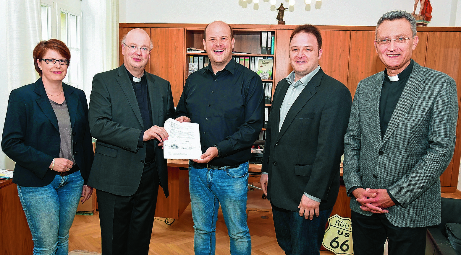 Heike Dören (BDKJ), Generalvikar Alfons Hardt, BDKJ-Diözesanvorsitzender Sebastian Koppers, Nico Schnittger (Pädagogischer Leiter für das Projekt) und Dompropst Monsignore Joachim Göbel beschlossen eine dauerhafte Kooperation an den Schulen in Trägerschaft des Erzbistums. Foto: pdp