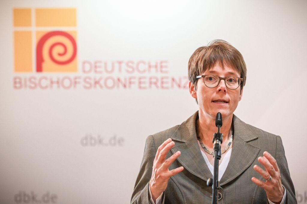 Beate Gilles, Generalsekretärin der Deutschen Bischofskonferenz (DBK), spricht bei der Pressekonferenz zur Eröffnung der Herbstvollversammlung der DBK am 26. September 2022 in Fulda. (Foto: KNA)