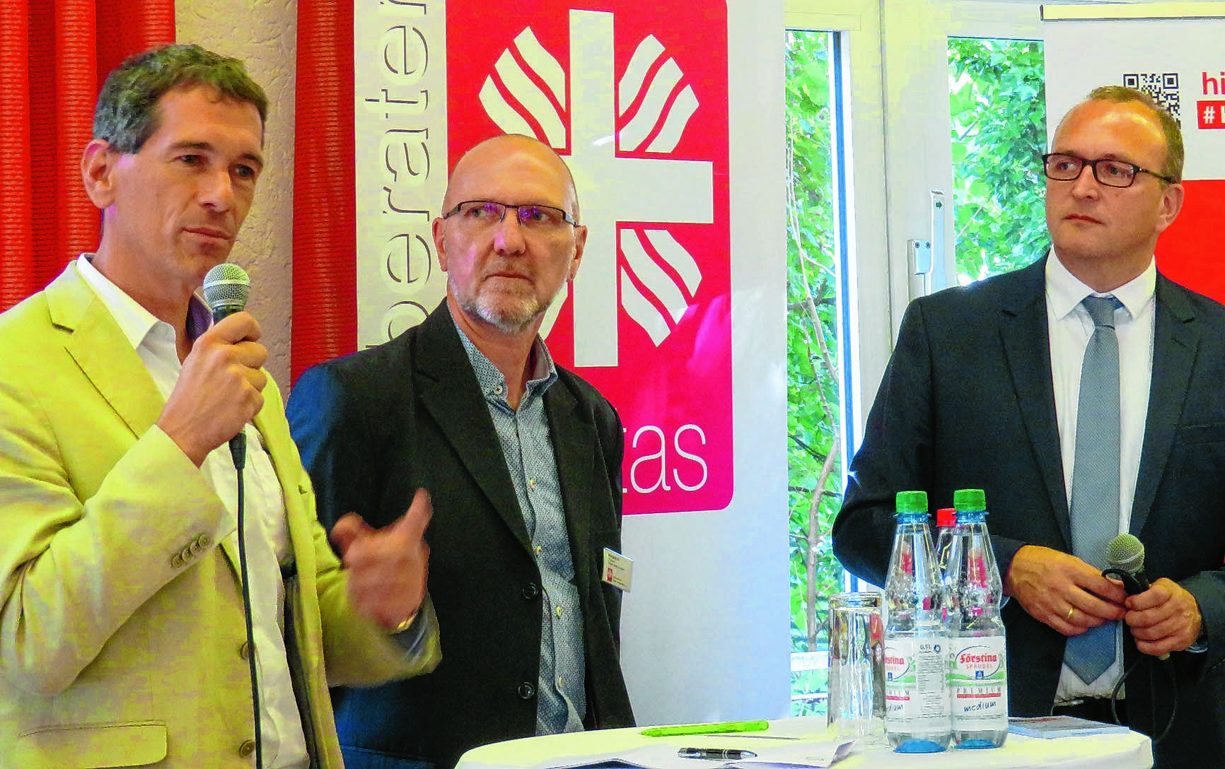 Diskutierten Faktoren, die das Ehrenamt erfolgreich machen (v. l.): der Landtagsabgeordnete und ehrenamtliche Vorsitzende des DRK Siegen-Nord, Jens Kamieth, Wolfgang Ax vom Projekt „Hörst du mich?“ und Siegens Caritas-Vorstand Matthias Vitt.Foto: Caritas Siegen
