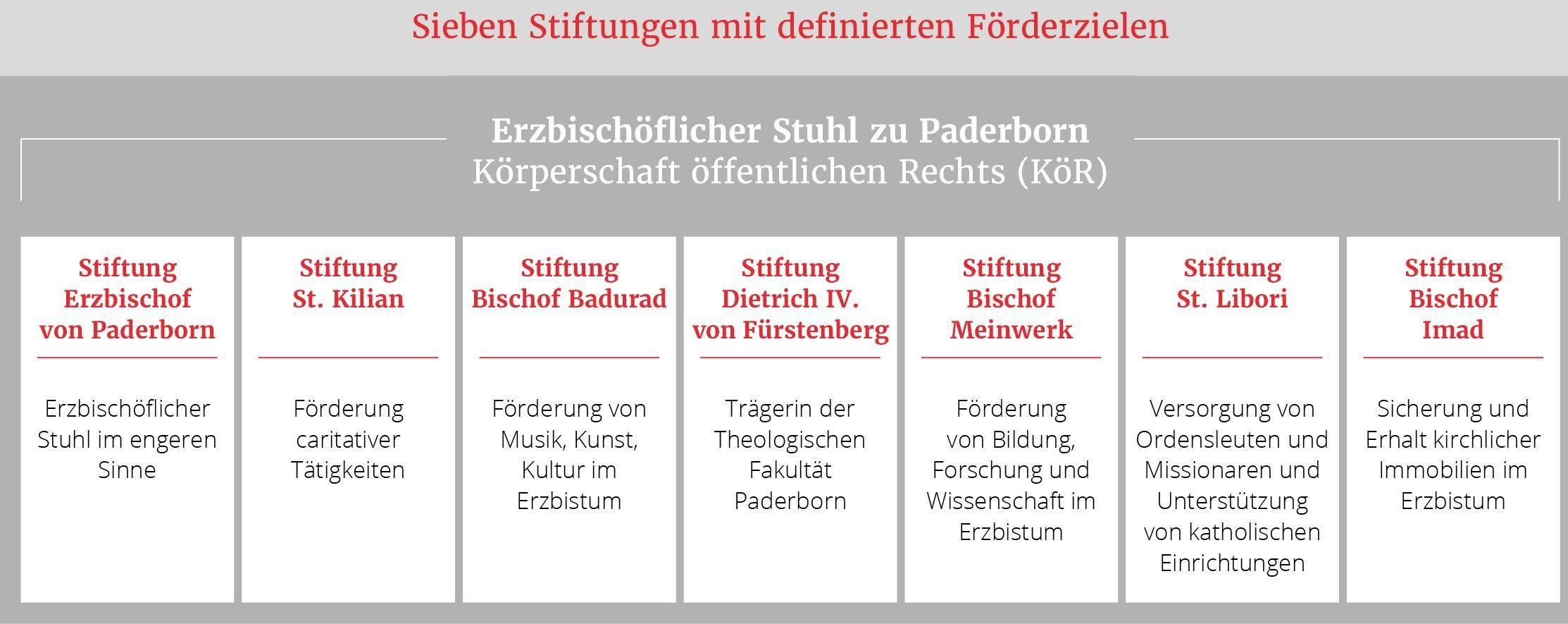 Zu den Stiftungen gehören die Stiftung Erzbischof von Paderborn (der Erzbischöfliche Stuhl im engeren Sinne), die Stiftung Dietrich IV. von Fürstenberg als Trägerin der Theologischen Fakultät sowie fünf weitere Stiftungen, die Fördermittel vor allem in den Bereichen Caritas, Bildung und Kultur vergeben und Sicherungsaufgaben übernehmen.