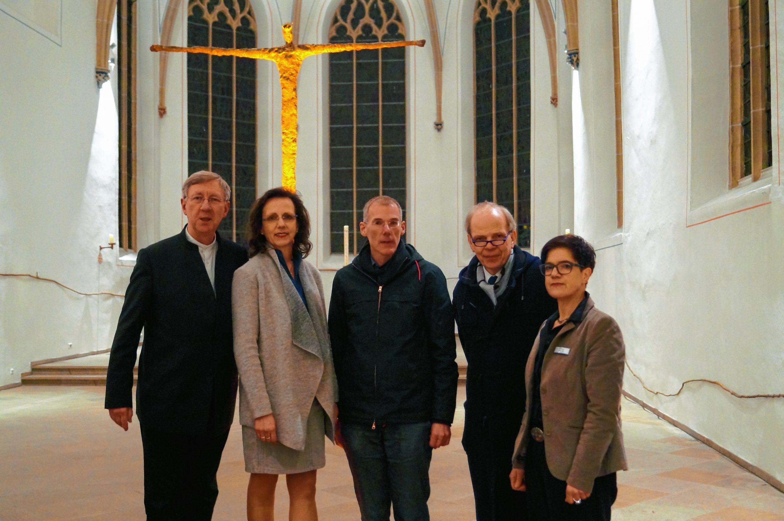 Pfarrer Schmidt, Gemeindereferentin Knepper, Pfarrer Mönkebüscher, Prof. Dr. Stiegemann und Jutta Loke (v. l.) informierten über das Baptisterium. Foto: Körtling