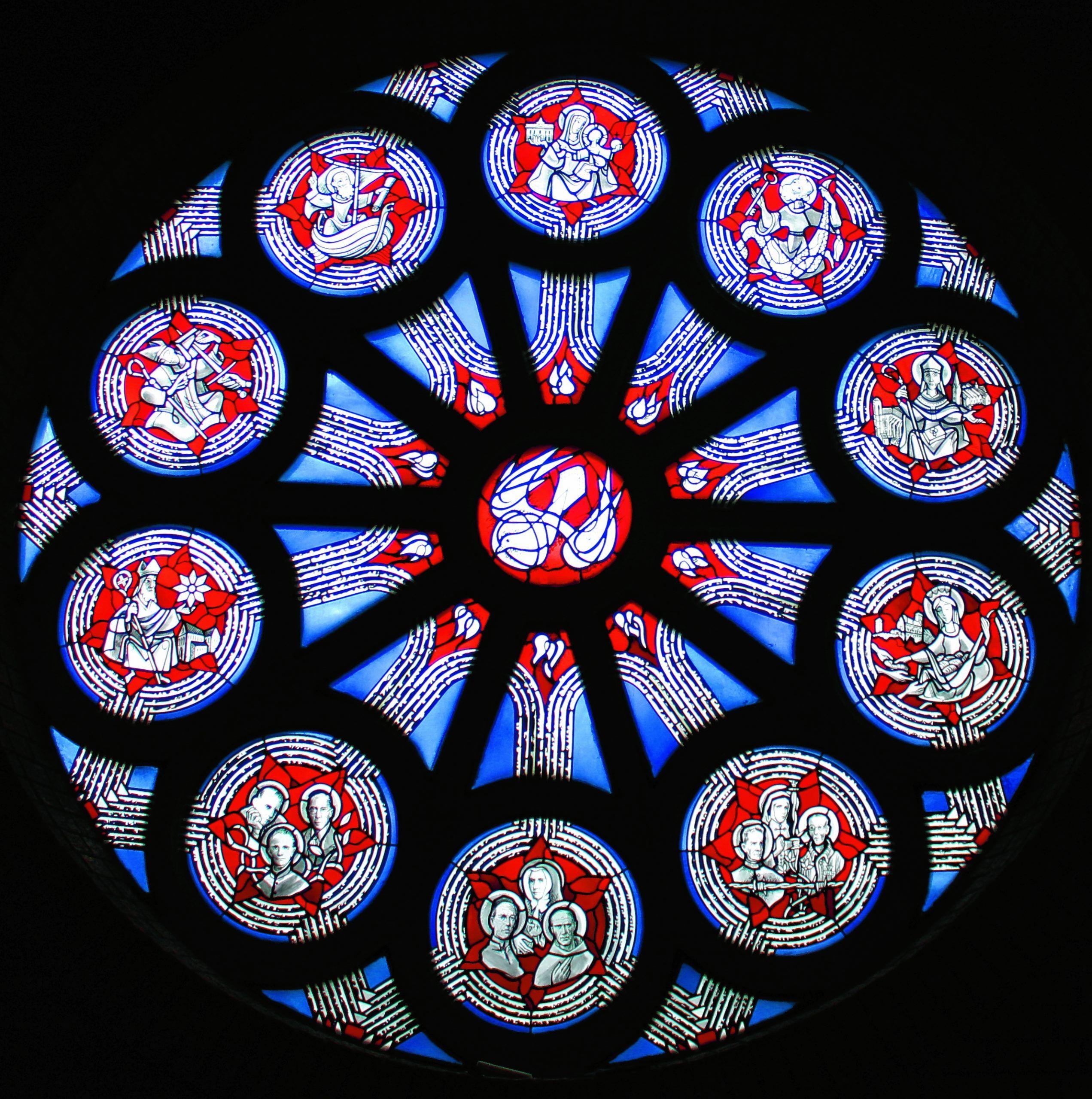 Die Rosette, in deren unteren Teil u. a. Edith Stein, Adolph Kolping und Bruder Jordan zu sehen sind.