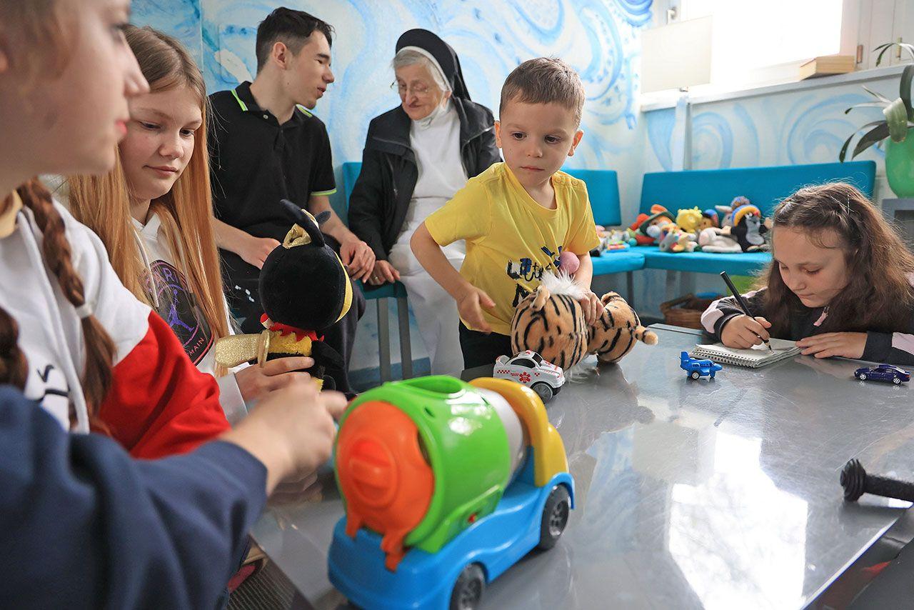 Zur Aufarbeitung der traumatischen Erlebnisse hat auch Sr. Raphaela beigetragen. Die 74-Jährige ist eine Vertrauensperson für die Kinder. Sie kommen auf sie zugerannt, schnell schließt sie die Mädchen und Jungen in ihre Arme. Dass sie kein Ukrainisch oder Russisch versteht, ist für die Ordensfrau kein Problem. „Zum Rutschen oder Schaukeln braucht man die Sprache nicht.“